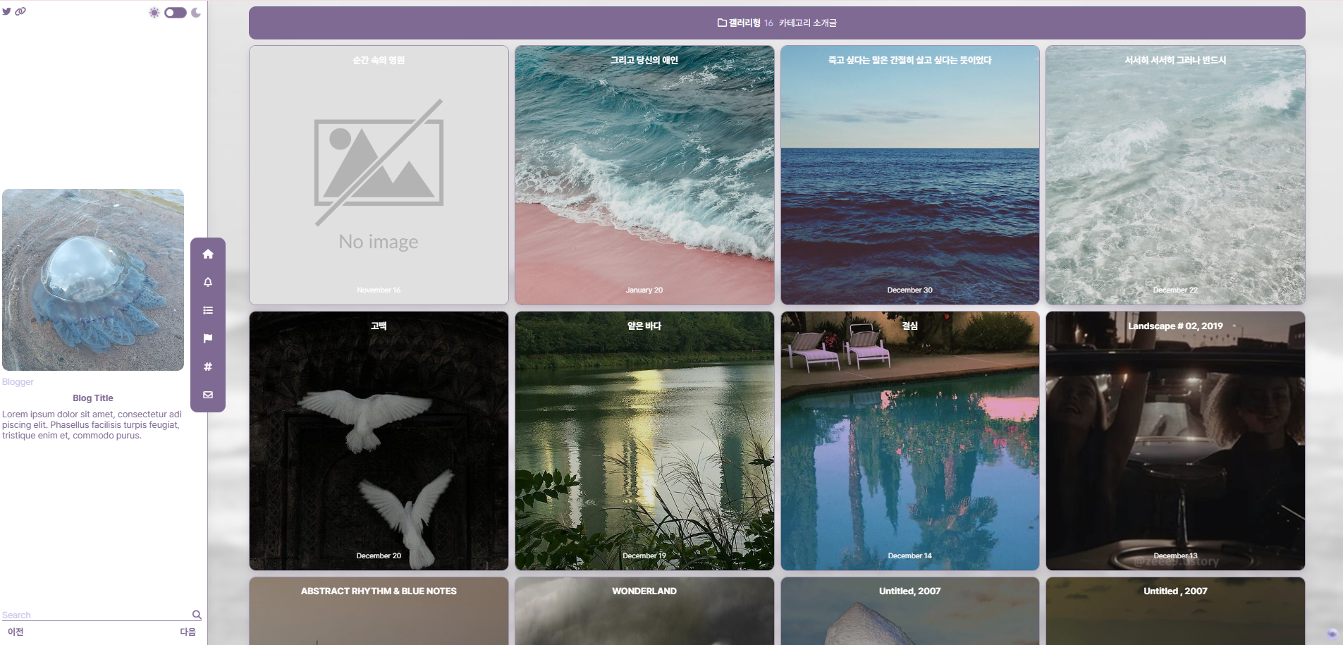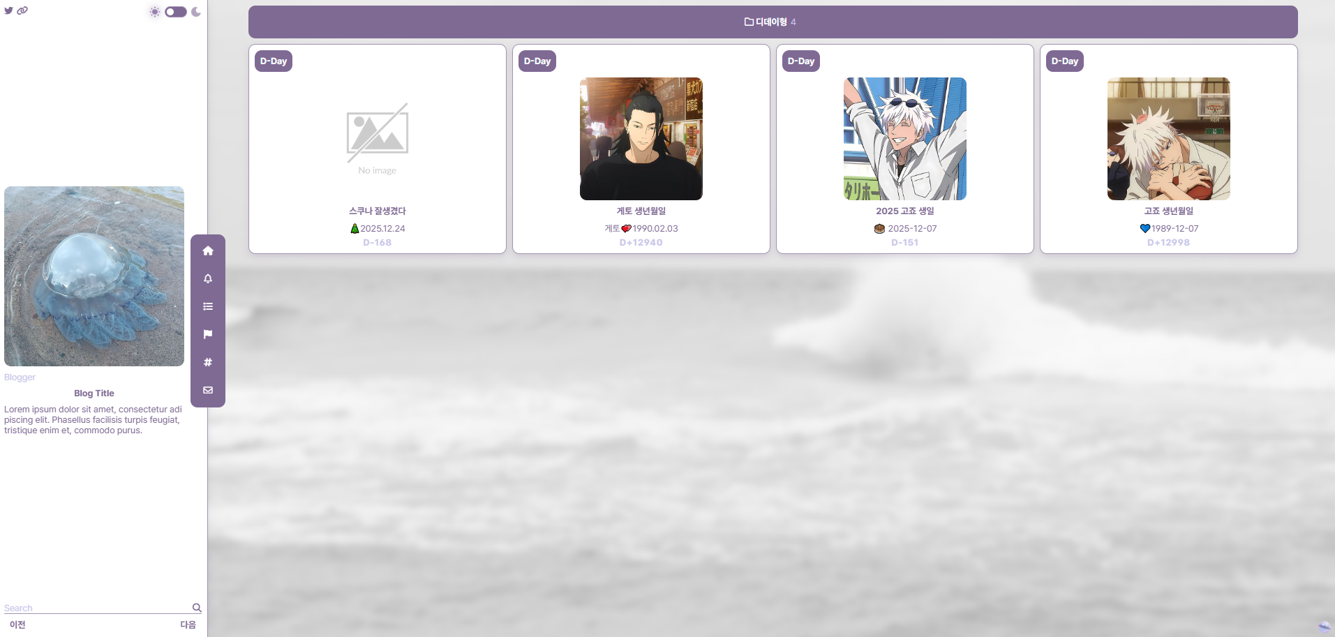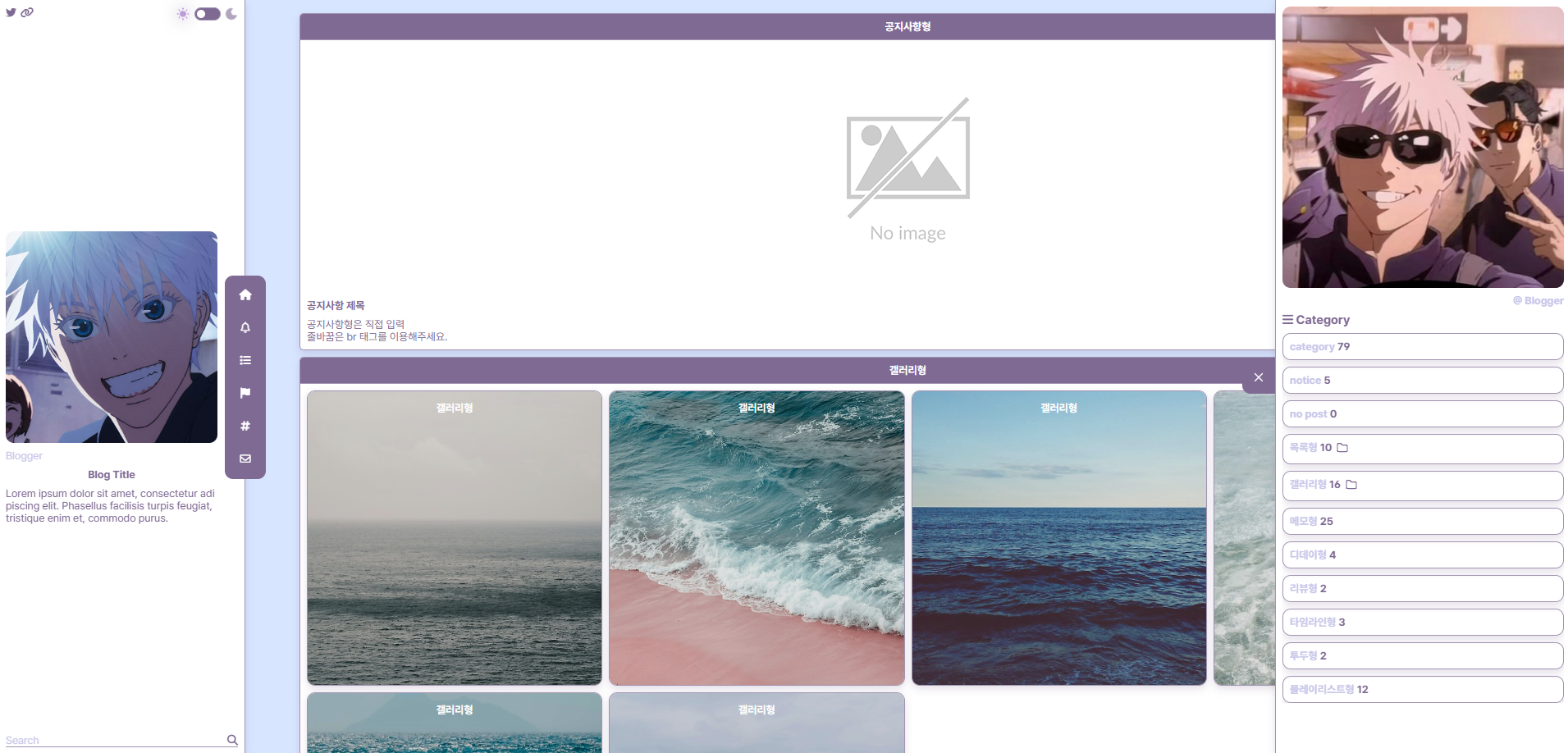 개인적으로 좋아하는 취향을 담아 티스토리 스킨을 만들고 있습니다. ✧٩(•́⌄•́๑)و ✧ 이미지 많이 넣기, 이것저것 정신없이 모아놓기, 레트로&빈티지, 보라색, 그리고 고죠 좋아함 등등..(ദ്ദിㆁᴗㆁ♥)