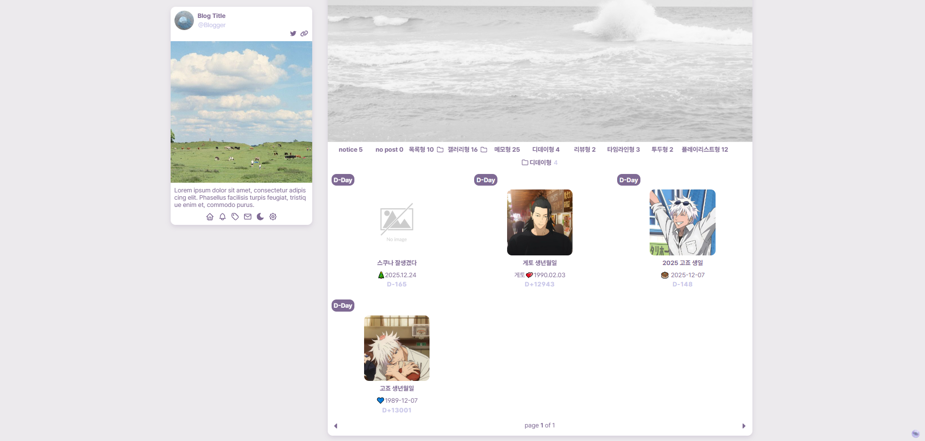 개인적으로 좋아하는 취향을 담아 티스토리 스킨을 만들고 있습니다. ✧٩(•́⌄•́๑)و ✧ 이미지 많이 넣기, 이것저것 정신없이 모아놓기, 레트로&빈티지, 보라색, 그리고 고죠 좋아함 등등..(ദ്ദിㆁᴗㆁ♥)