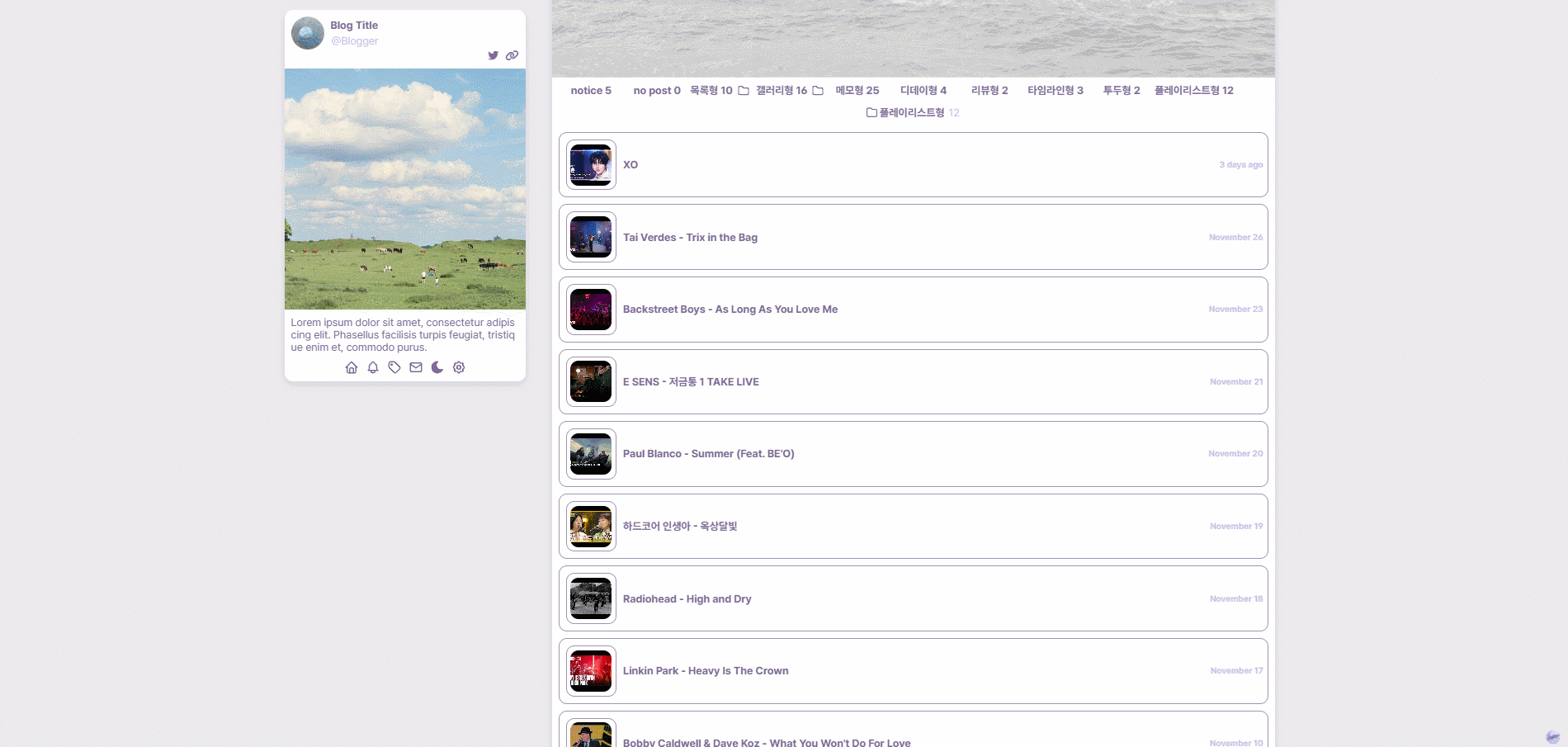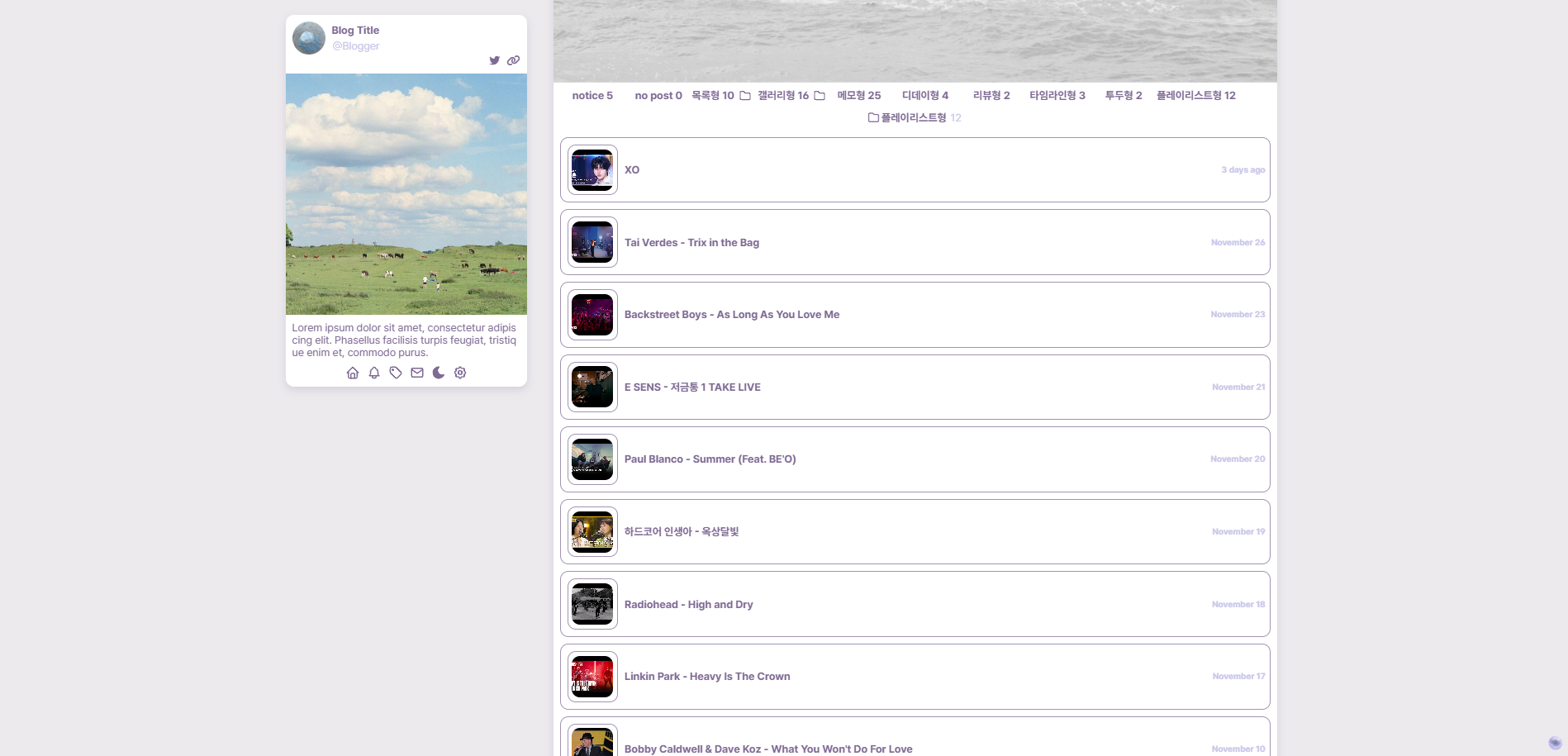 홈커버 (공지사항, 갤러리, 목록, 메모, 요약, 디데이, 리뷰, 타임라인, 투두, 플레이리스트형1, 플레이리스트형2)