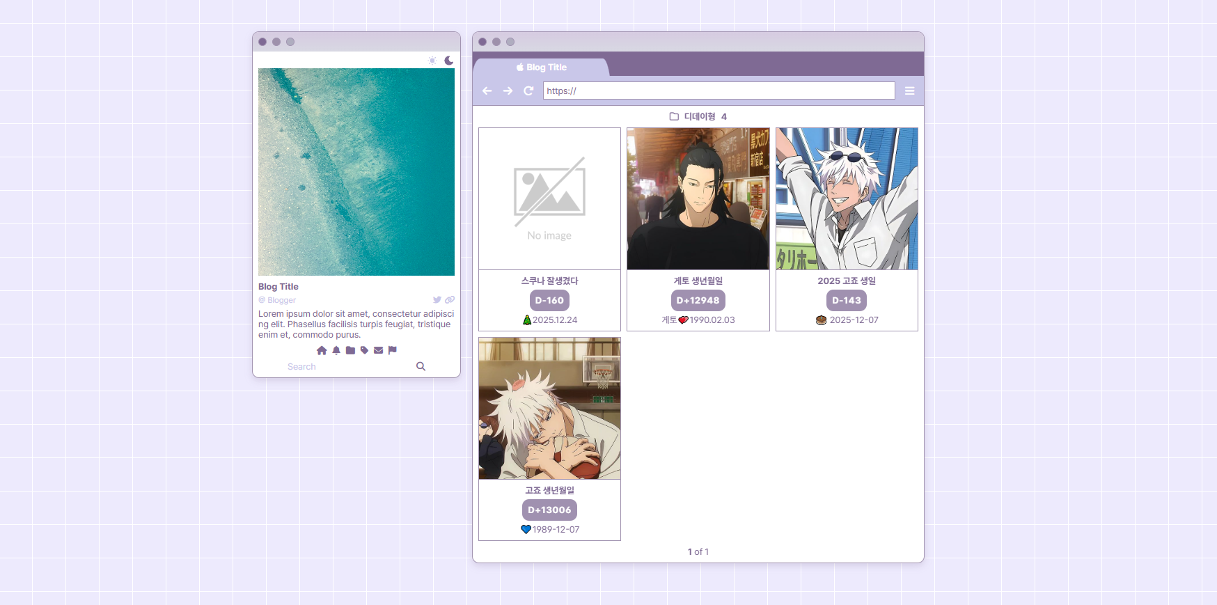개인적으로 좋아하는 취향을 담아 티스토리 스킨을 만들고 있습니다. ✧٩(•́⌄•́๑)و ✧ 이미지 많이 넣기, 이것저것 정신없이 모아놓기, 레트로&빈티지, 보라색, 그리고 고죠 좋아함 등등..(ദ്ദിㆁᴗㆁ♥)