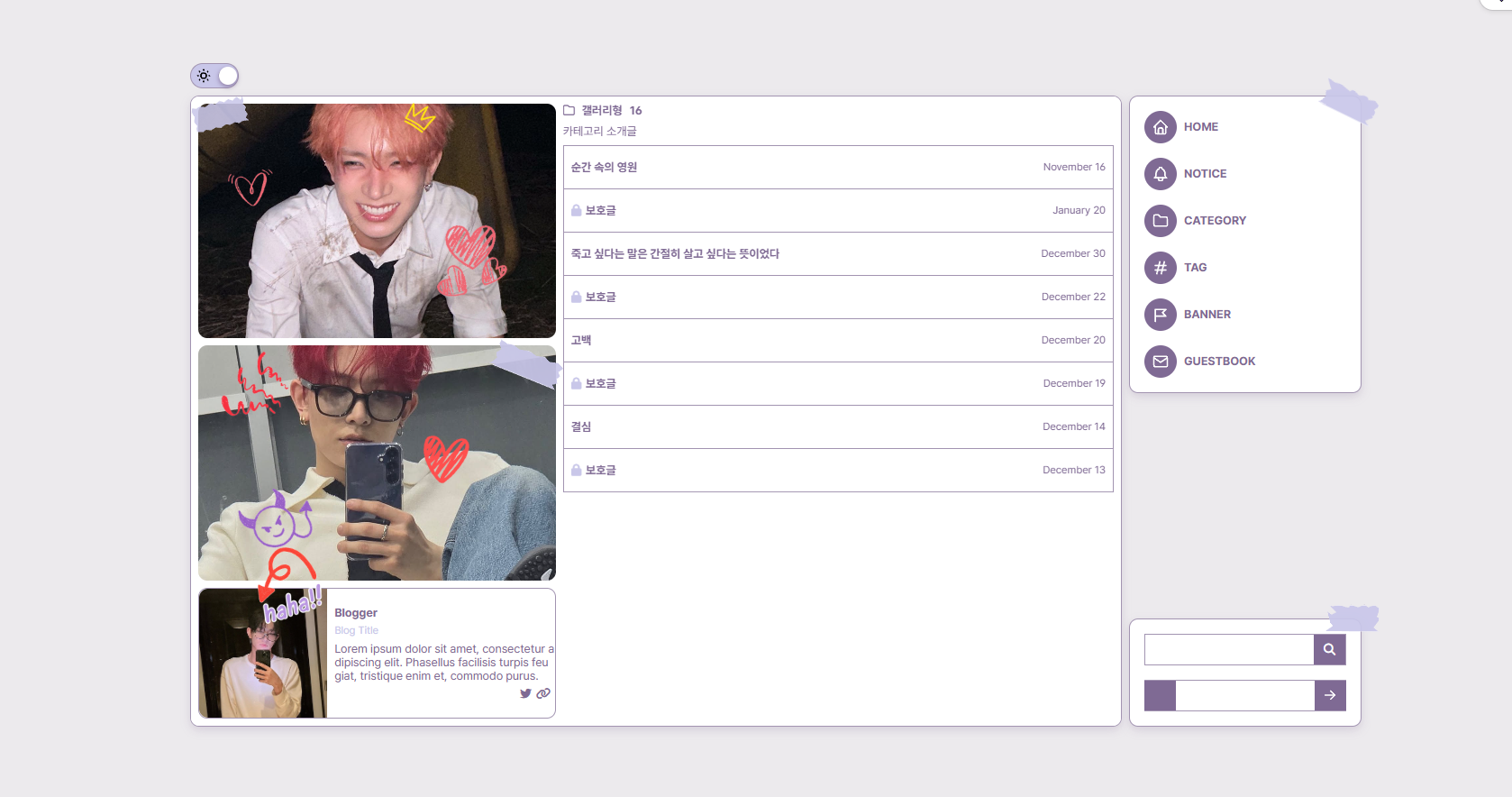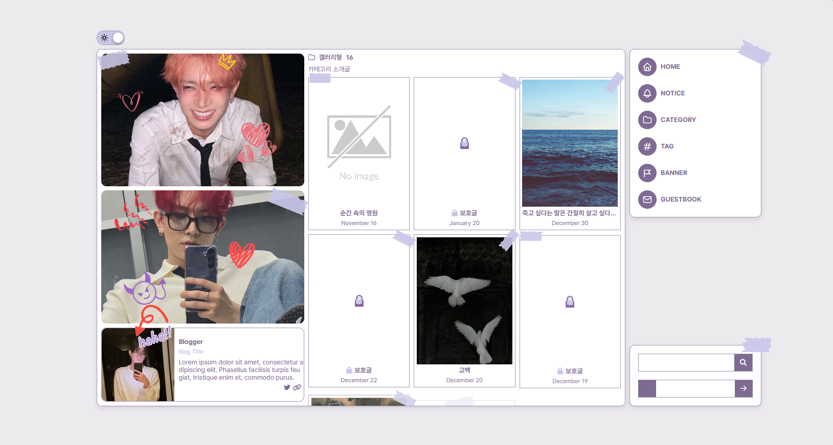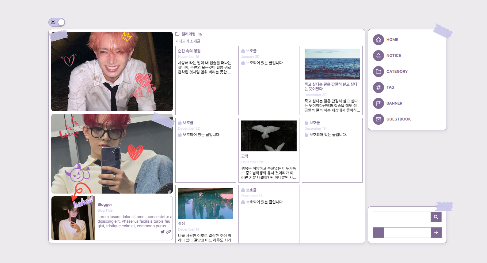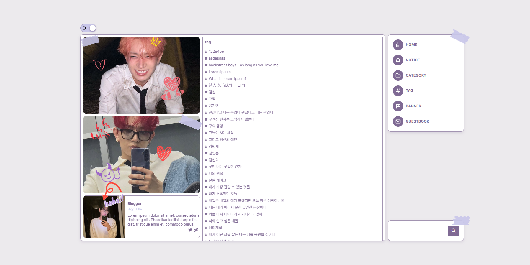 개인적으로 좋아하는 취향을 담아 티스토리 스킨을 만들고 있습니다. ✧٩(•́⌄•́๑)و ✧ 이미지 많이 넣기, 이것저것 정신없이 모아놓기, 레트로&빈티지, 보라색, 그리고 고죠 좋아함 등등..(ദ്ദിㆁᴗㆁ♥)