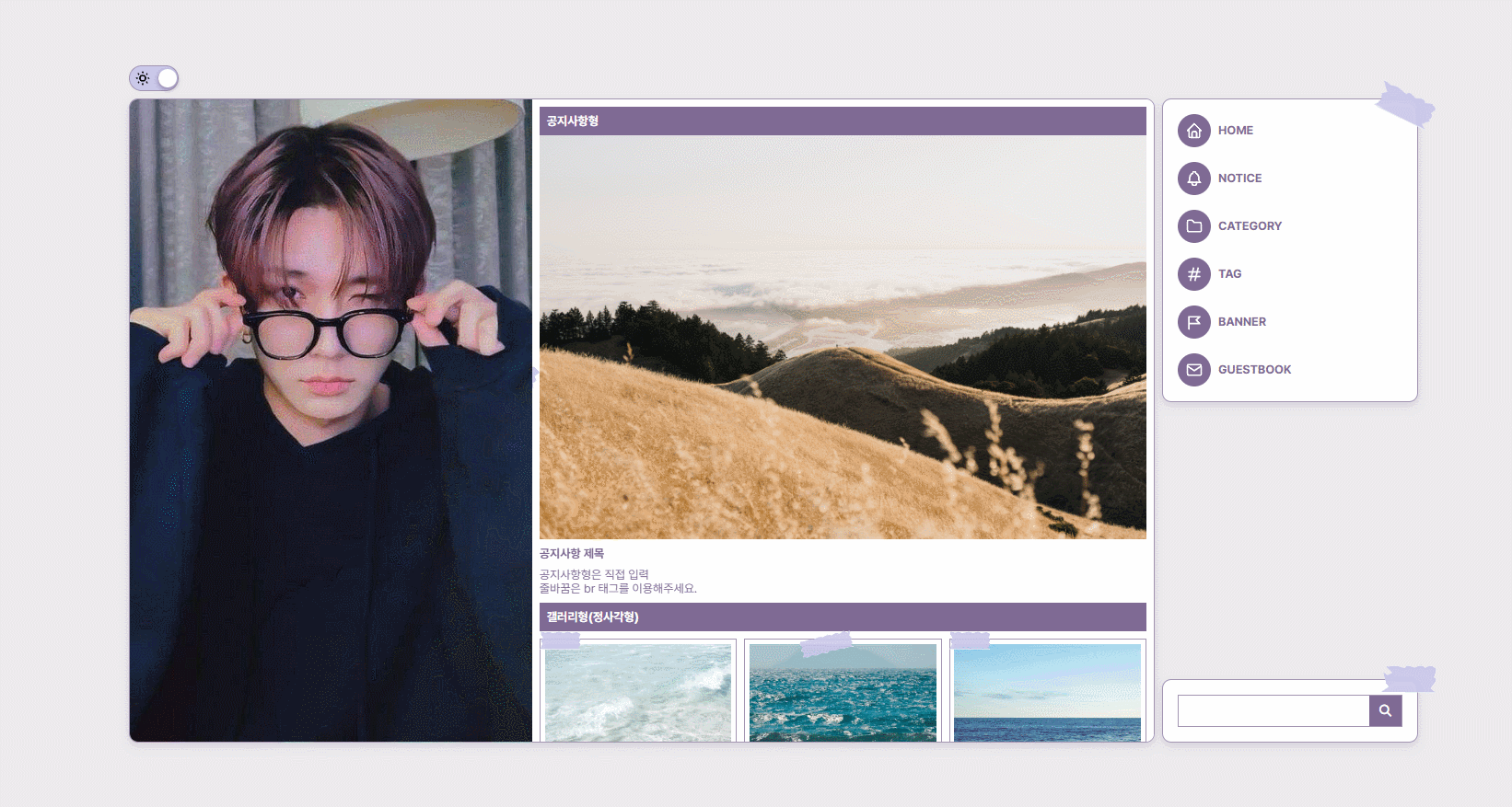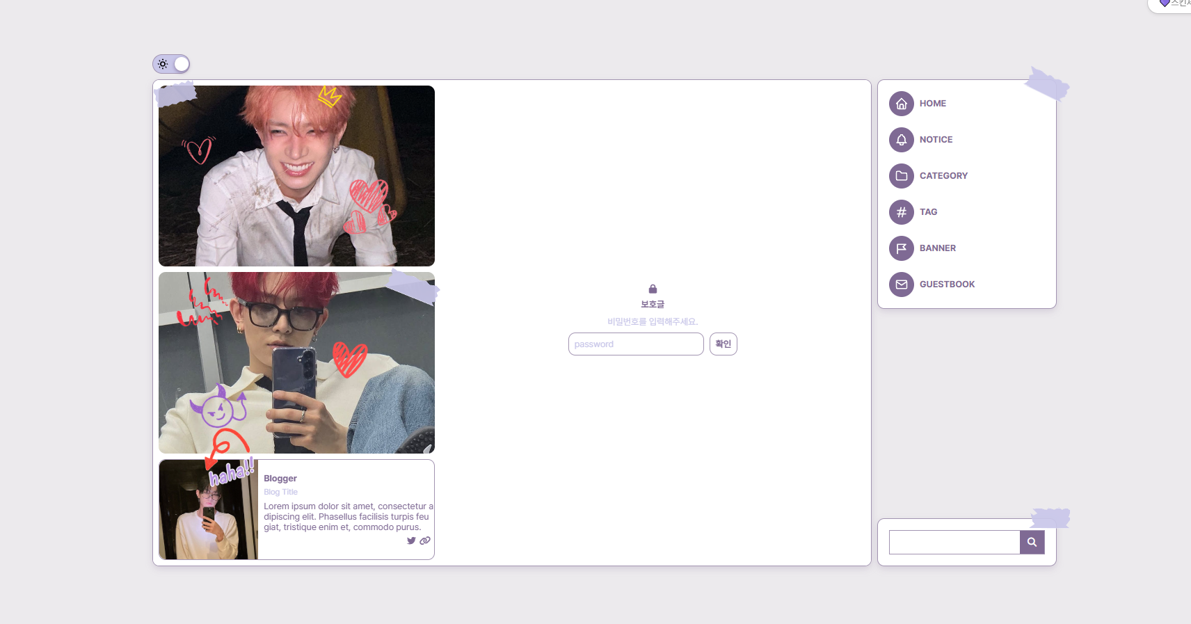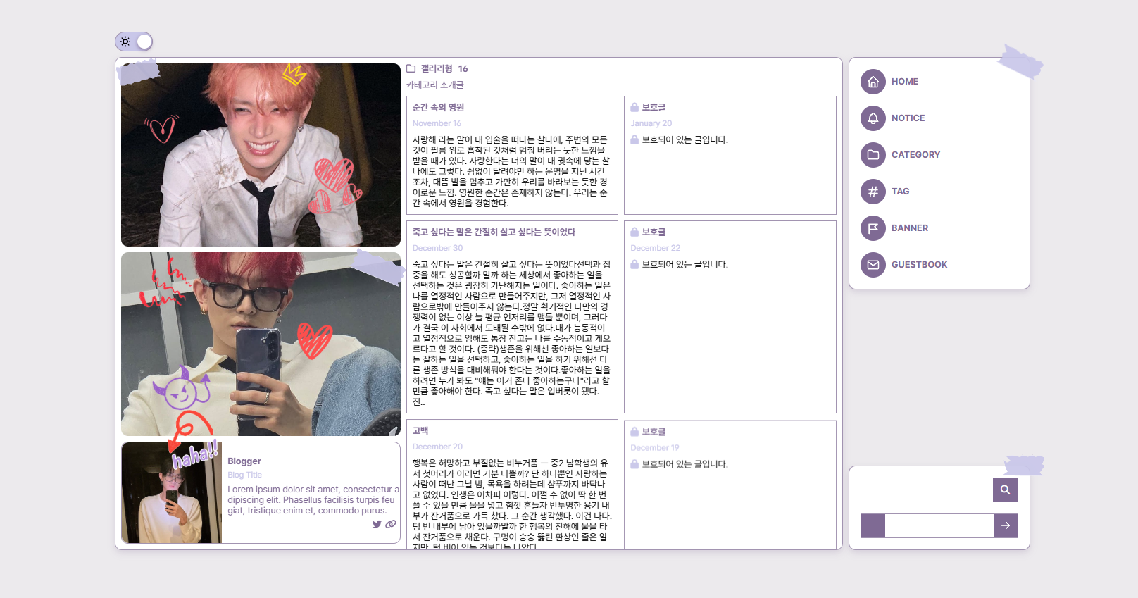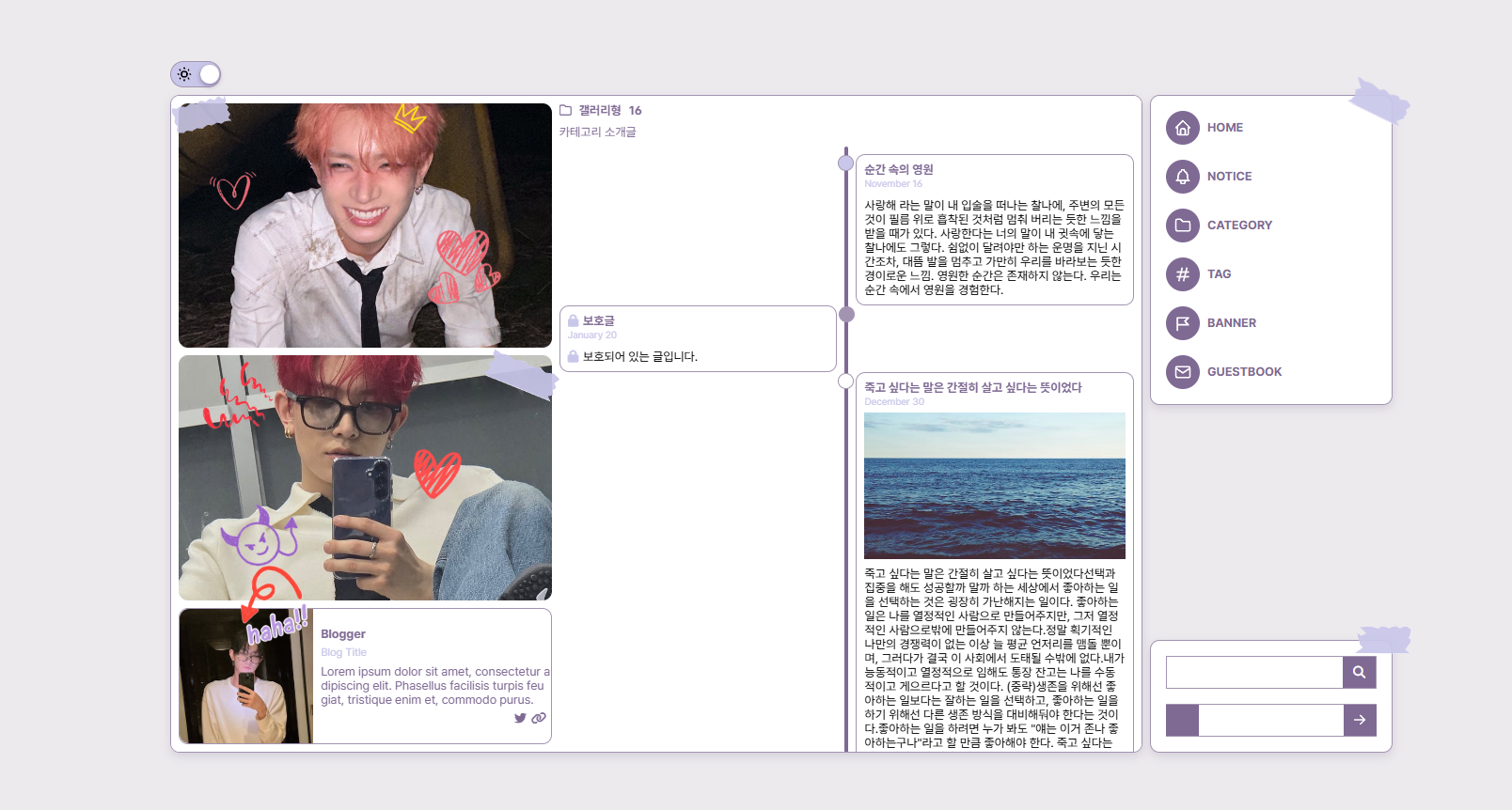 개인적으로 좋아하는 취향을 담아 티스토리 스킨을 만들고 있습니다. ✧٩(•́⌄•́๑)و ✧ 이미지 많이 넣기, 이것저것 정신없이 모아놓기, 레트로&빈티지, 보라색, 그리고 고죠 좋아함 등등..(ദ്ദിㆁᴗㆁ♥)