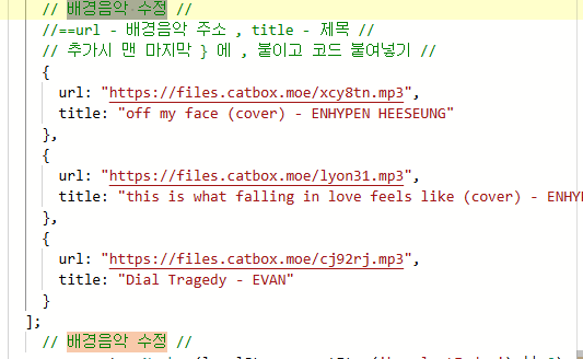 url: " " 안에 주소 수정(확장자 mp3) title: " " 안에 타이틀(제목) 수정 해주시면 됩니다.