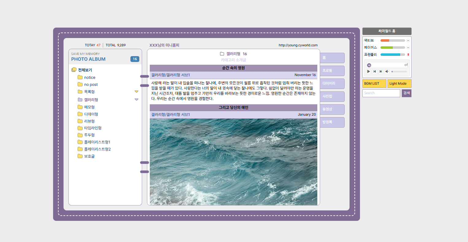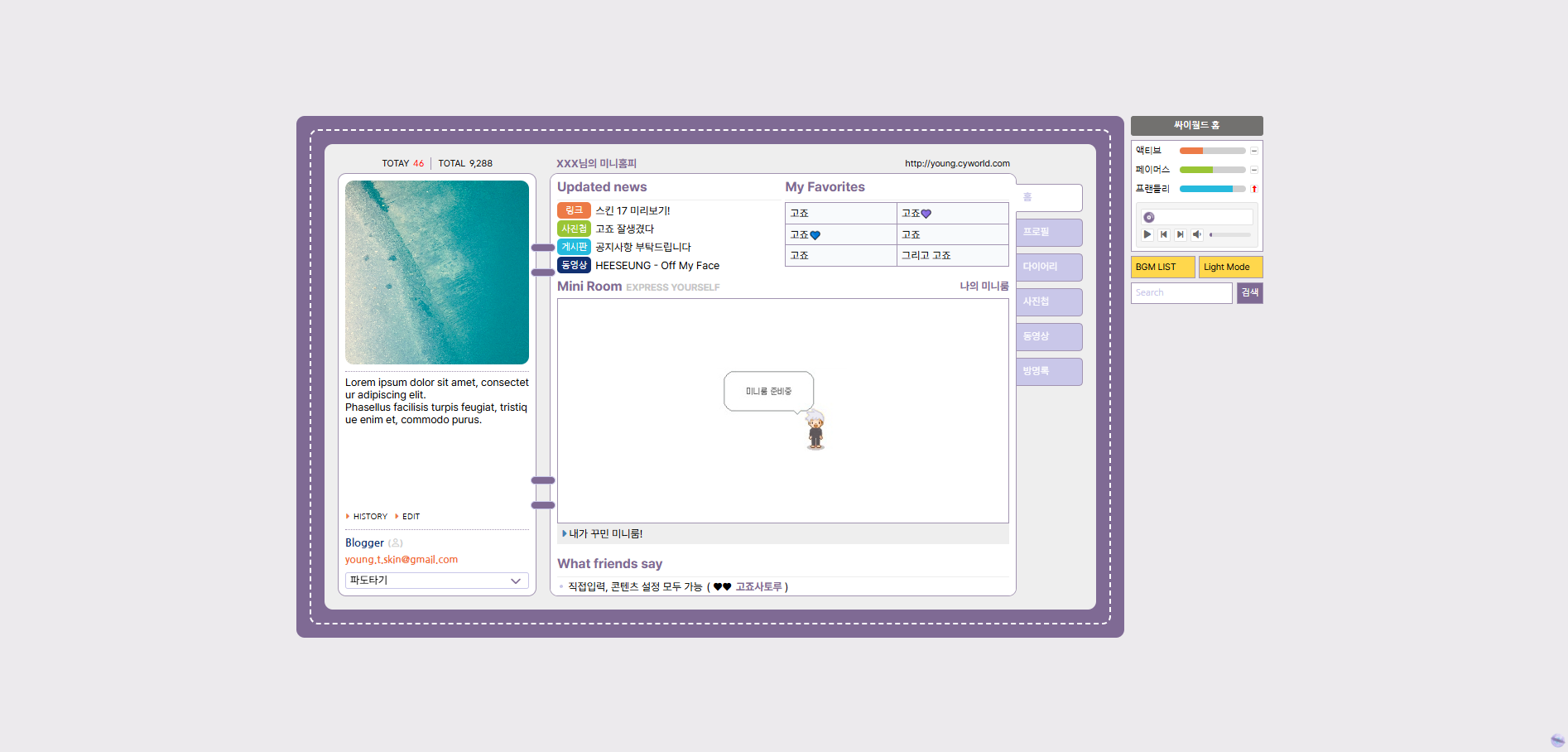 * 하단 (싸이월드형) - 최신글 / 글선택 사용 - 최신글, 글선택 사용시 내용(일촌평) - 제목(일촌명) 카테고리(이름) 으로 표시됩니다.