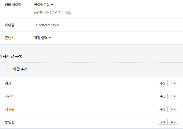 - 콘텐츠 : 직접 입력 - 타이틀: 링크, 사진첩, 게시판, 동영상 넷 중 하나 선택해서 입력 (내용은 간단히)
