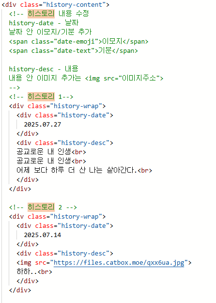 * 자기소개 히스토리 수정방법 - 스킨편집하기 - html - ctrl+f(찾기) - 히스토리 내용 검색
