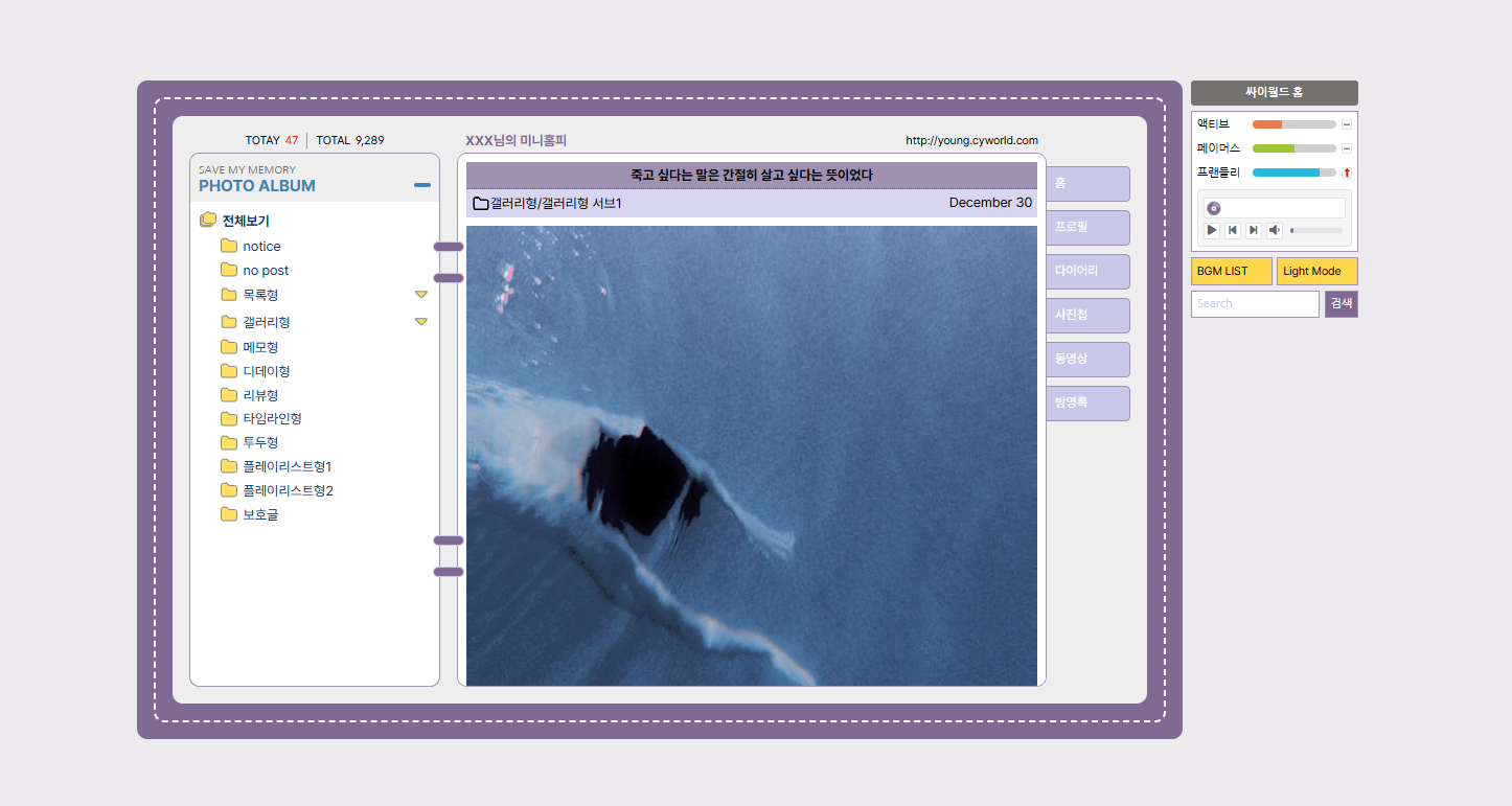 * 배경음악은 차례대로 재생됩니다. * 페이지 이동시 끊긴 부분부터 재생됩니다. * mp3 파일만 가능합니다. * BGM LIST 클릭시 추가한 리스트 표시. - 노래제목 클릭시 그 곡 재생, 반복 클릭시 한곡 반복 재생. * 배경음악(mp3 업로드) 방법은 이 글 본문 하단(배경음악넣기) 부분을 참고해주시면 됩니다. * 업로드까지 완료하셨으면 스킨편집하기 - html - ctrl+f(찾기) - 배경음악 수정 검색