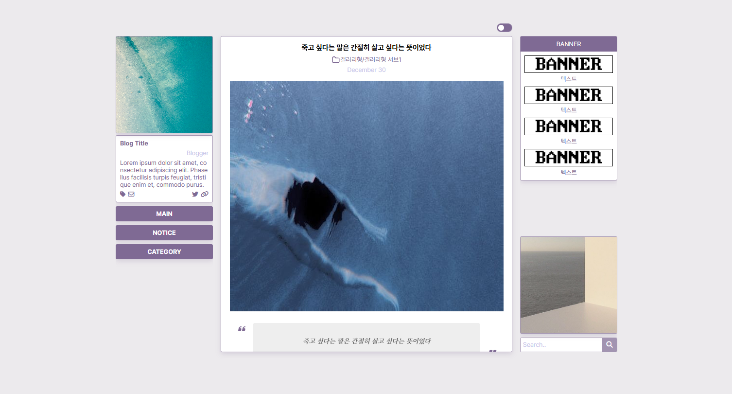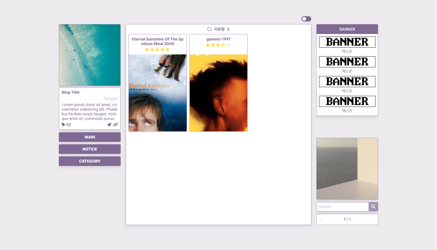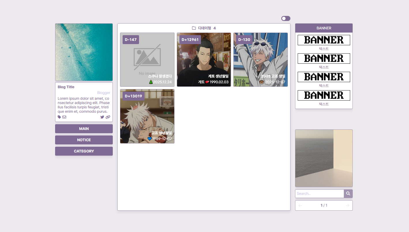 개인적으로 좋아하는 취향을 담아 티스토리 스킨을 만들고 있습니다. ✧٩(•́⌄•́๑)و ✧ 이미지 많이 넣기, 이것저것 정신없이 모아놓기, 레트로&빈티지, 보라색, 그리고 고죠 좋아함 등등..(ദ്ദിㆁᴗㆁ♥)