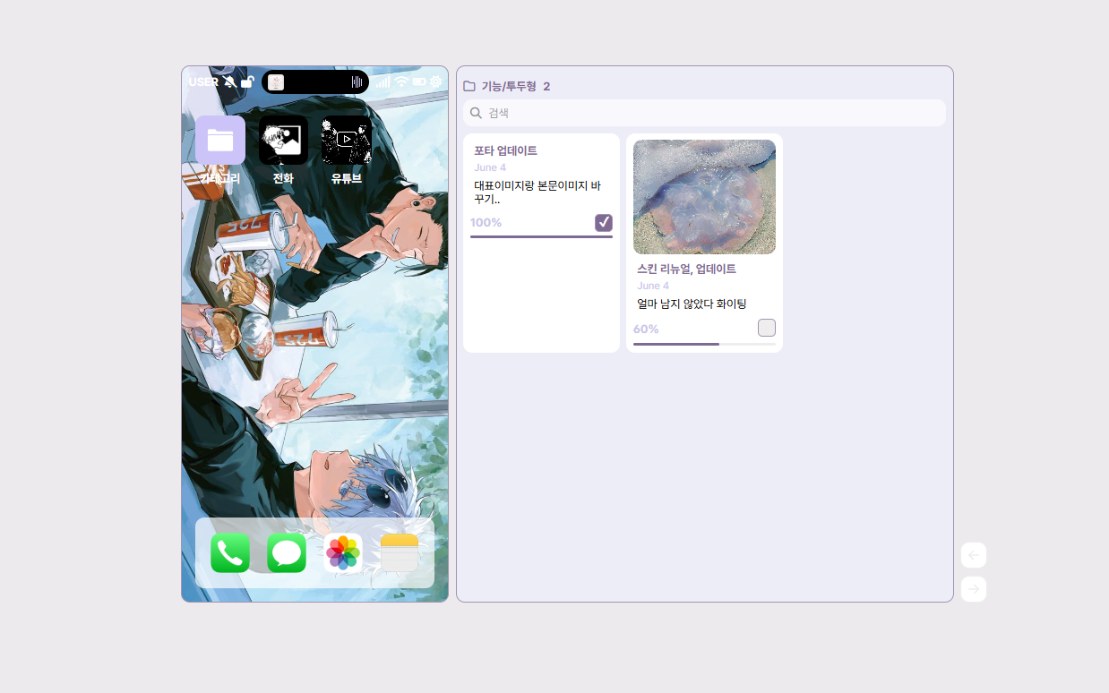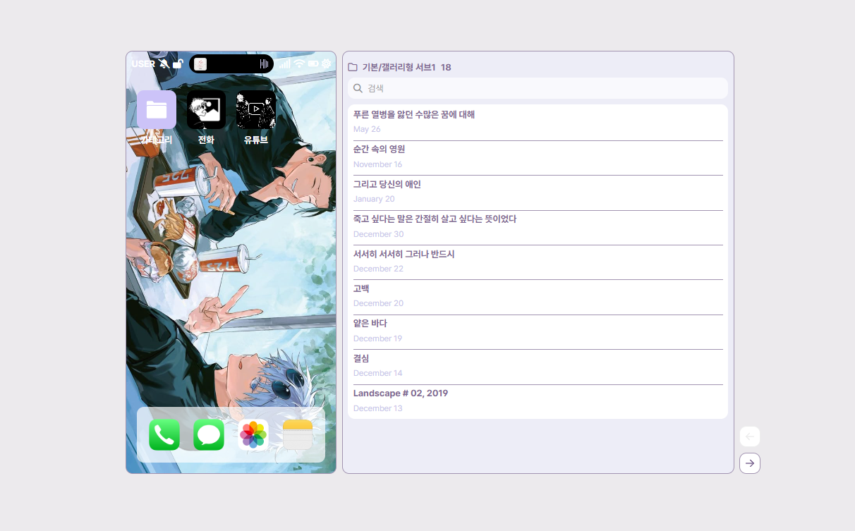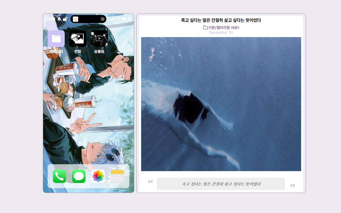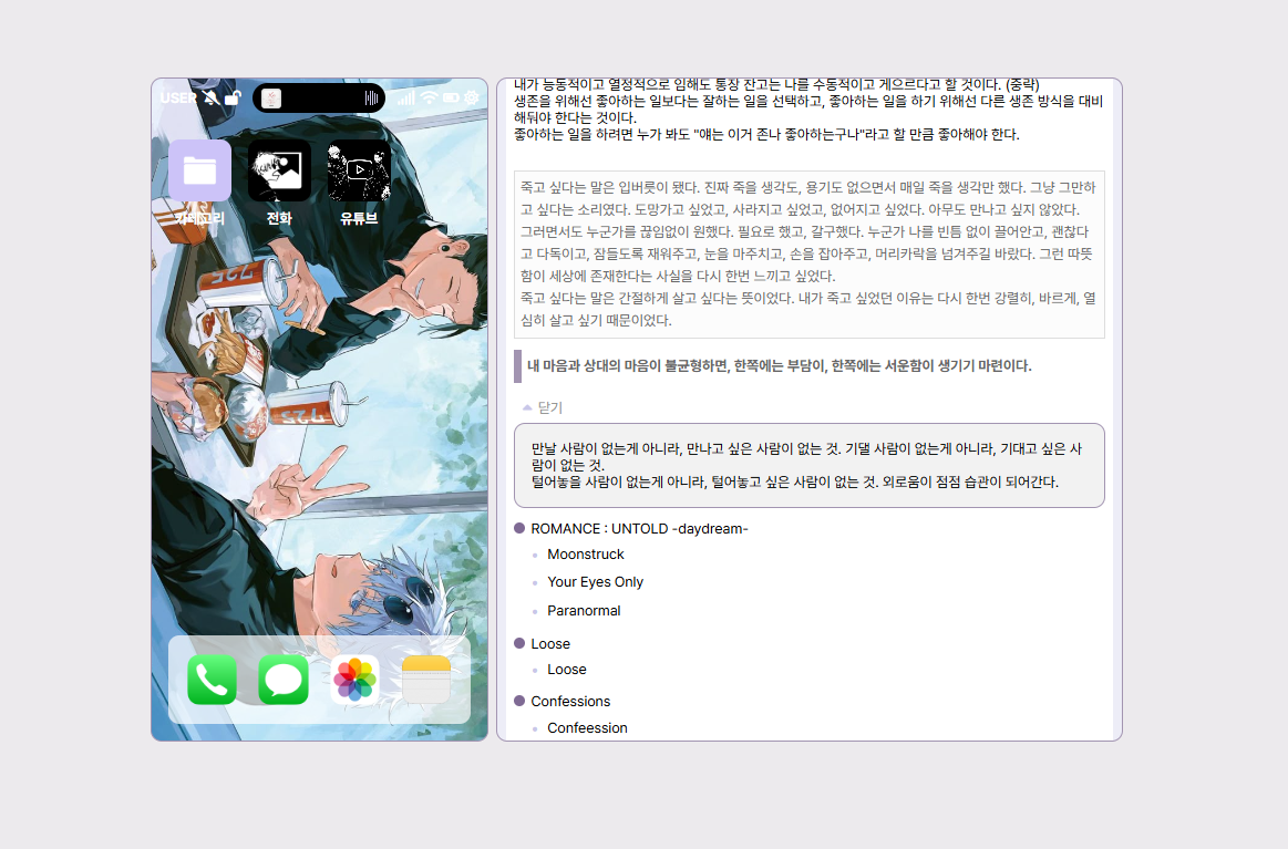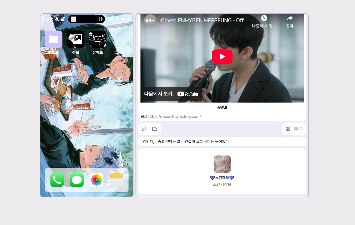 개인적으로 좋아하는 취향을 담아 티스토리 스킨을 만들고 있습니다. ✧٩(•́⌄•́๑)و ✧ 이미지 많이 넣기, 이것저것 정신없이 모아놓기, 레트로&빈티지, 보라색, 그리고 고죠 좋아함 등등..(ദ്ദിㆁᴗㆁ♥)
