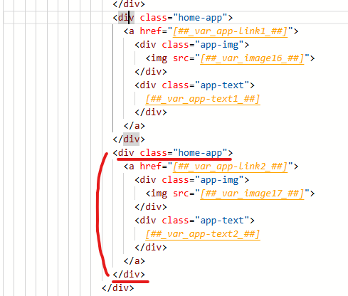 - 붙여넣기한 코드 링크주소(var_app-link2) 이미지(var_image17) 앱이름(app-text2) 수정
