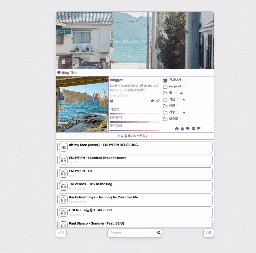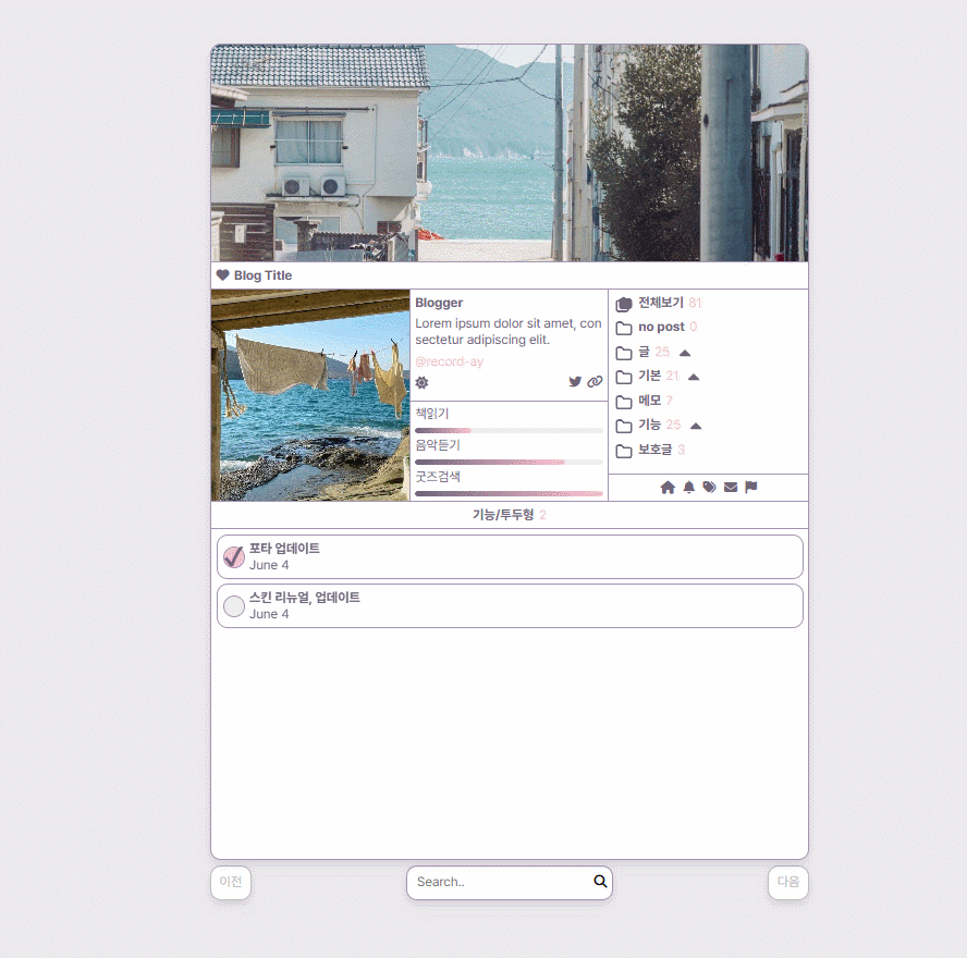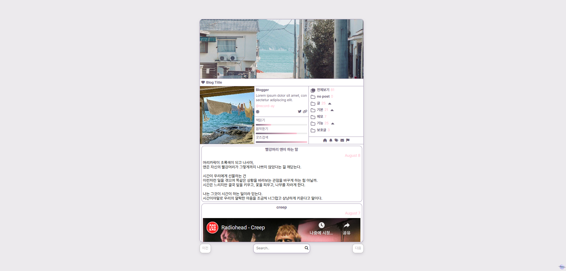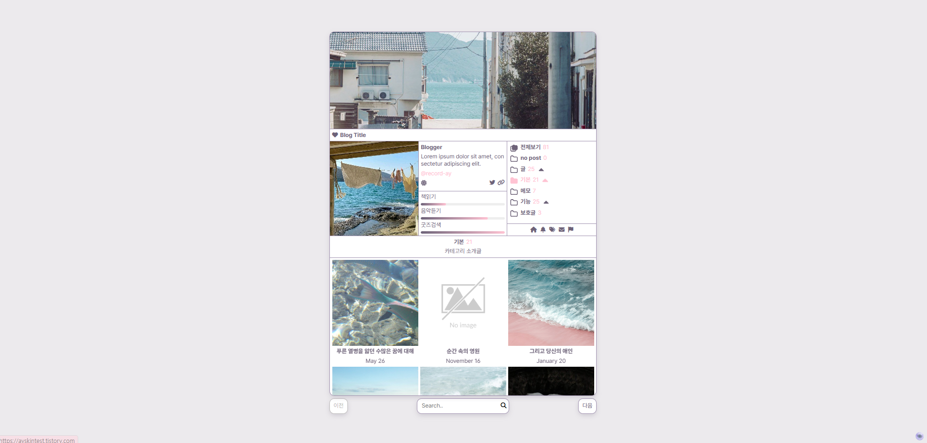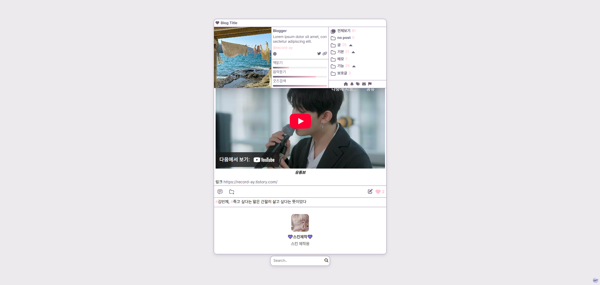 개인적으로 좋아하는 취향을 담아 티스토리 스킨을 제작합니다 ꒰՞⸝⸝•̀𖥦•́꒱و ̖́-♡