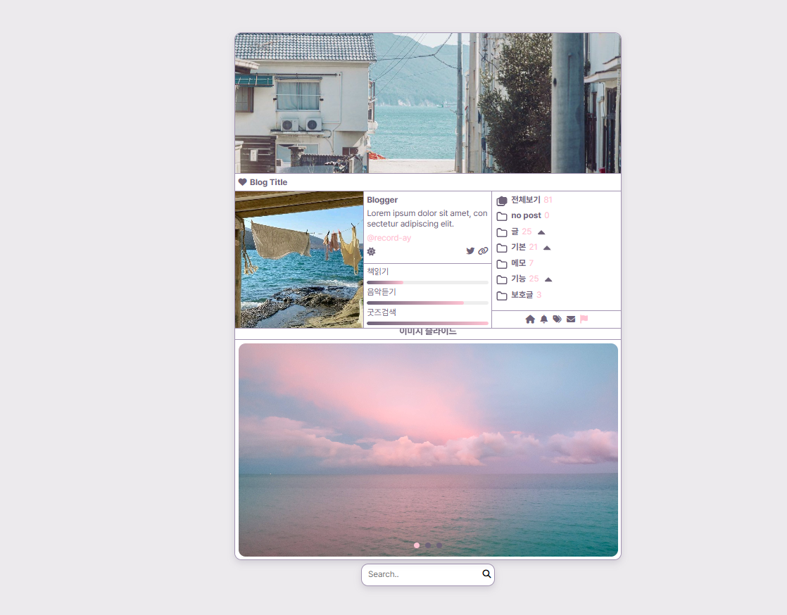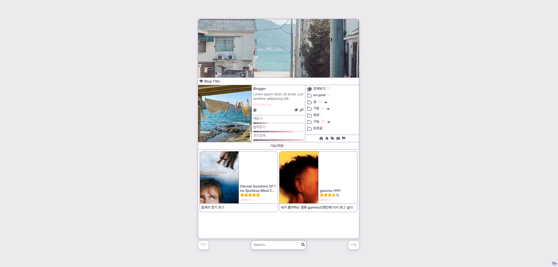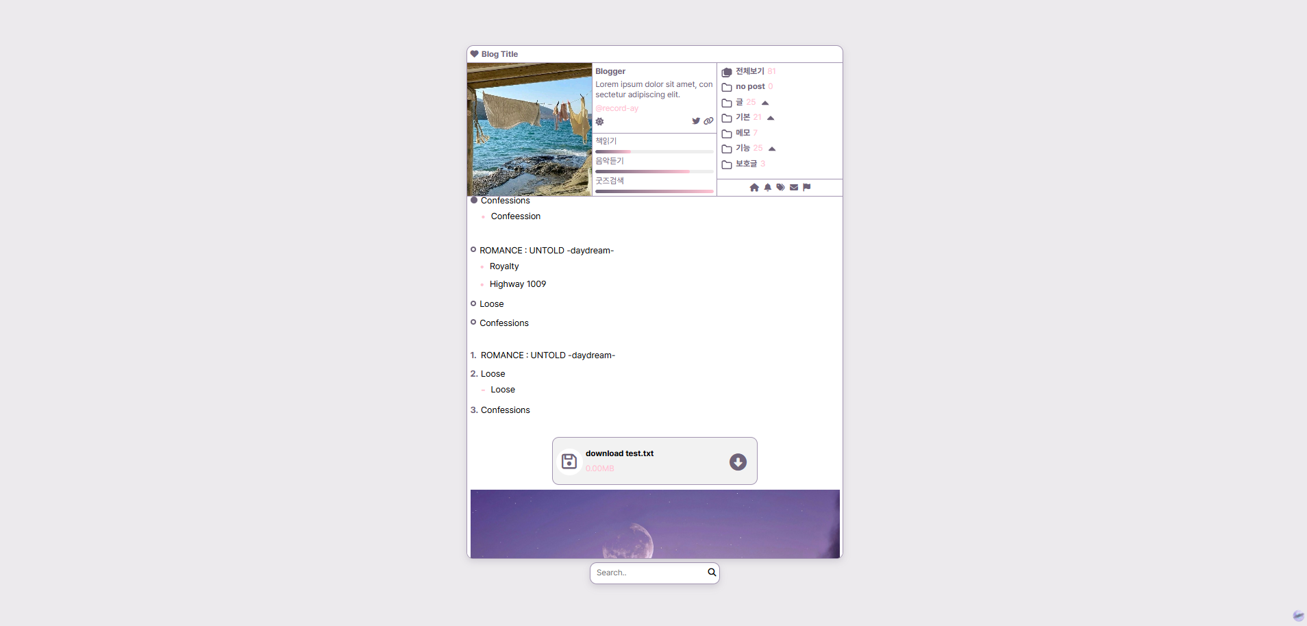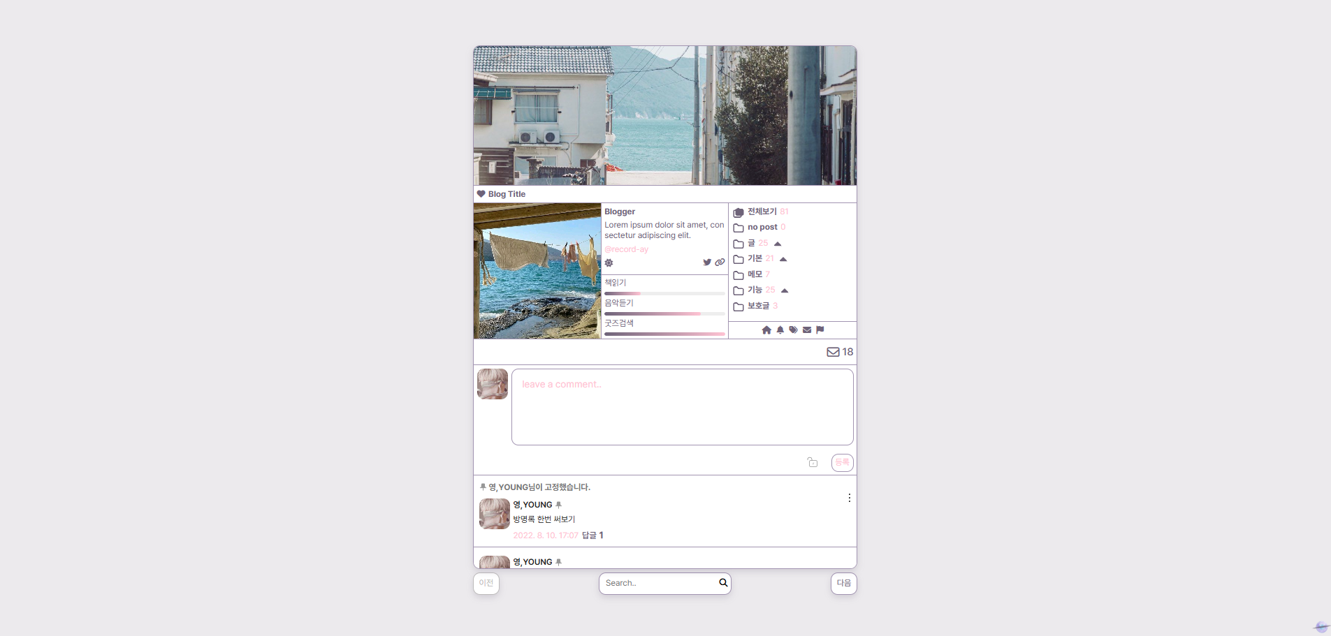 개인적으로 좋아하는 취향을 담아 티스토리 스킨을 제작합니다 ꒰՞⸝⸝•̀𖥦•́꒱و ̖́-♡