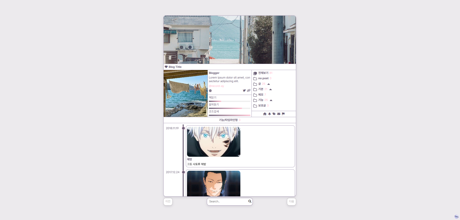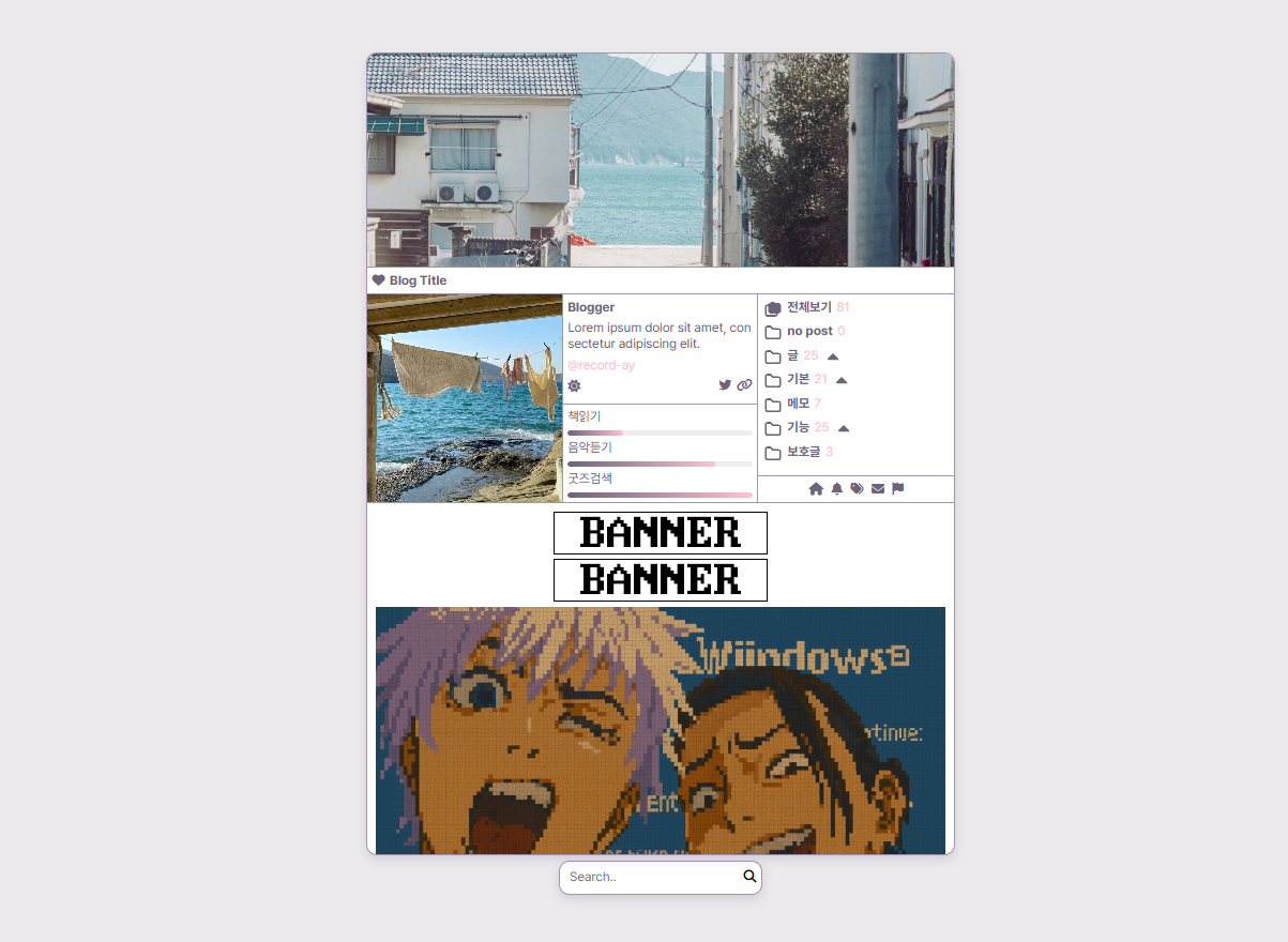 개인적으로 좋아하는 취향을 담아 티스토리 스킨을 만들고 있습니다. ✧٩(•́⌄•́๑)و ✧ 이미지 많이 넣기, 이것저것 정신없이 모아놓기, 레트로&빈티지, 보라색, 그리고 고죠 좋아함 등등..(ദ്ദിㆁᴗㆁ♥)
