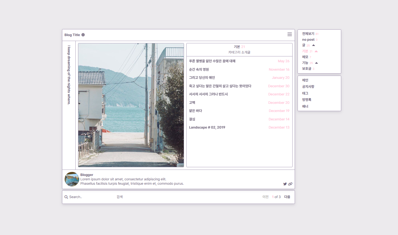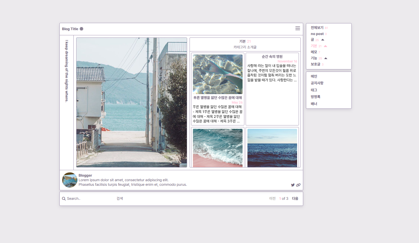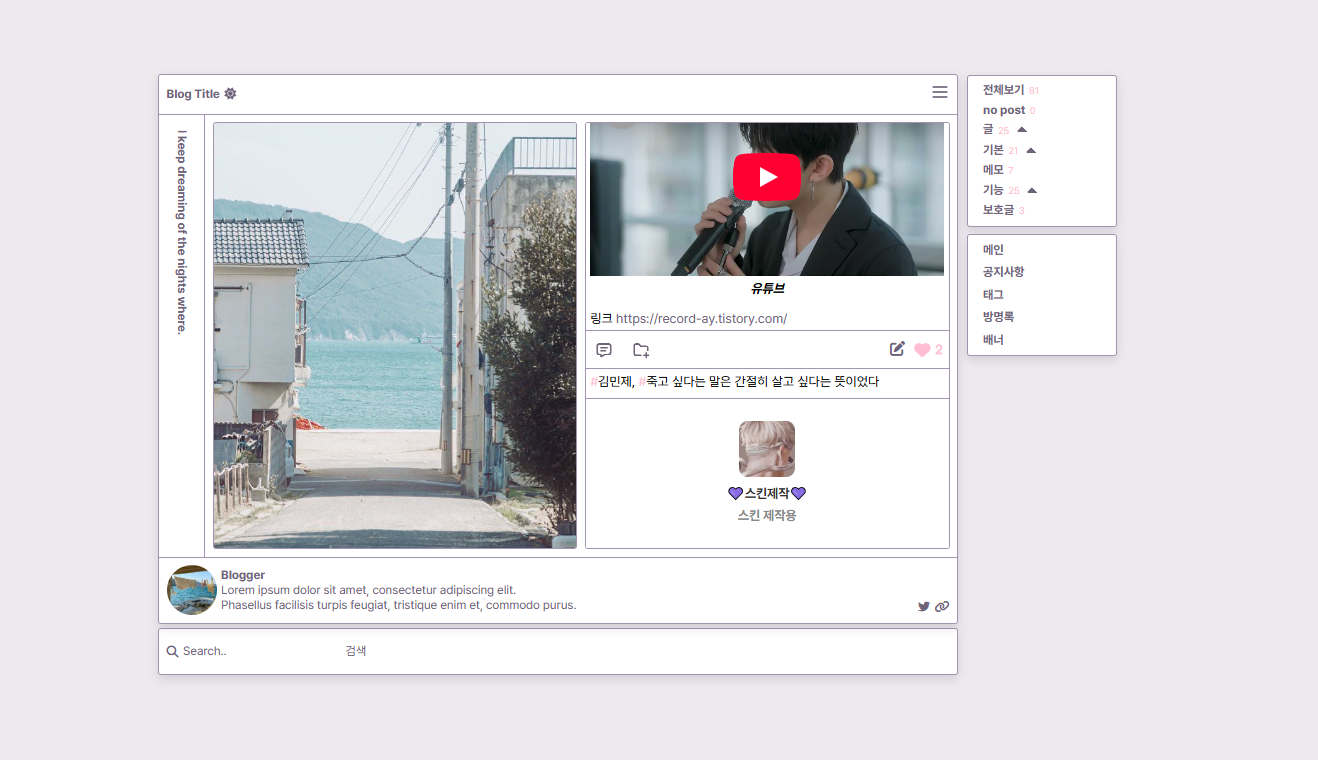 개인적으로 좋아하는 취향을 담아 티스토리 스킨을 제작합니다 ꒰՞⸝⸝•̀𖥦•́꒱و ̖́-♡