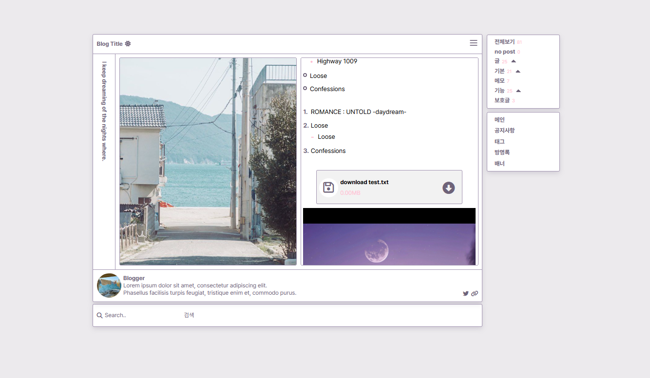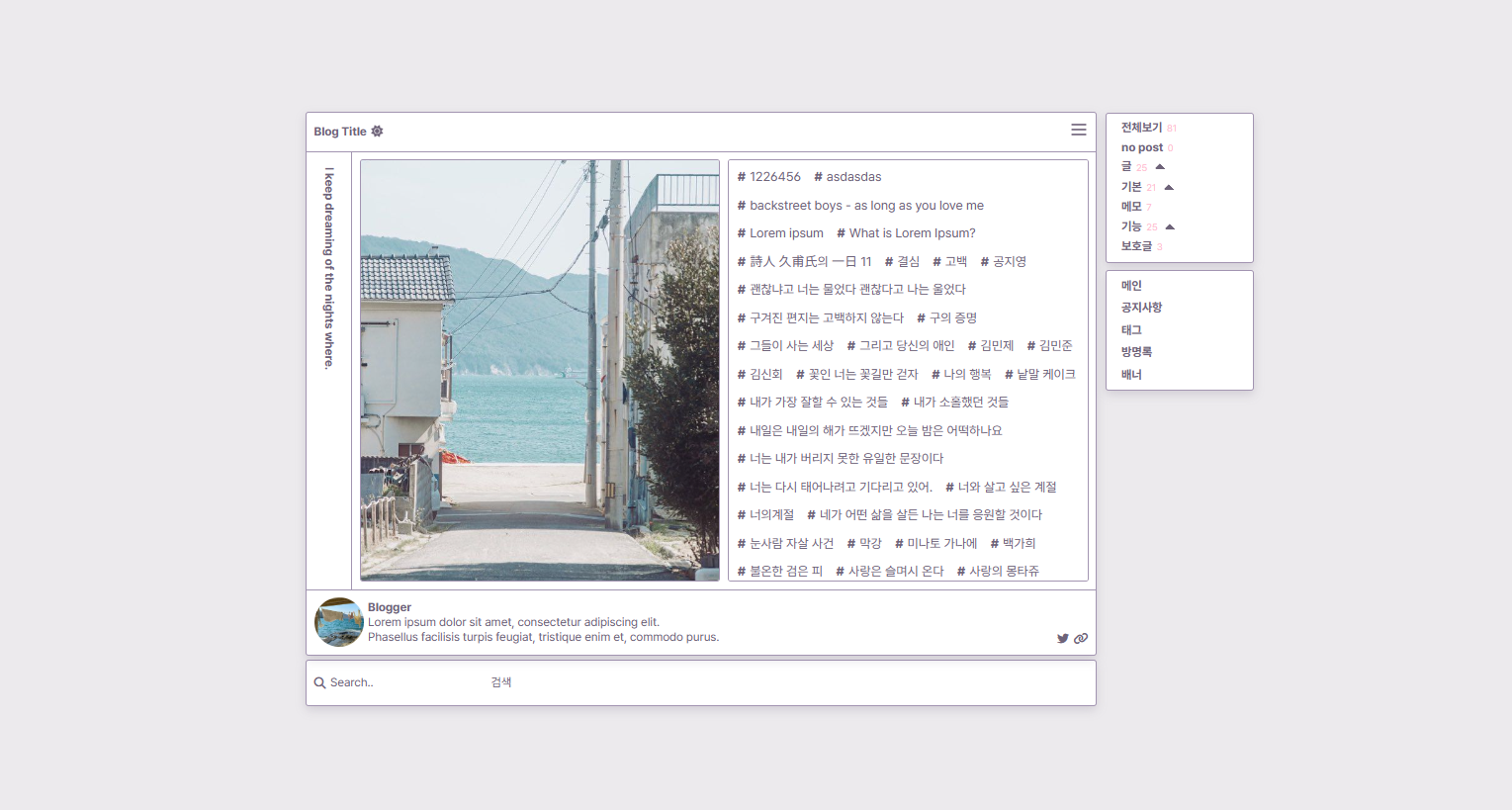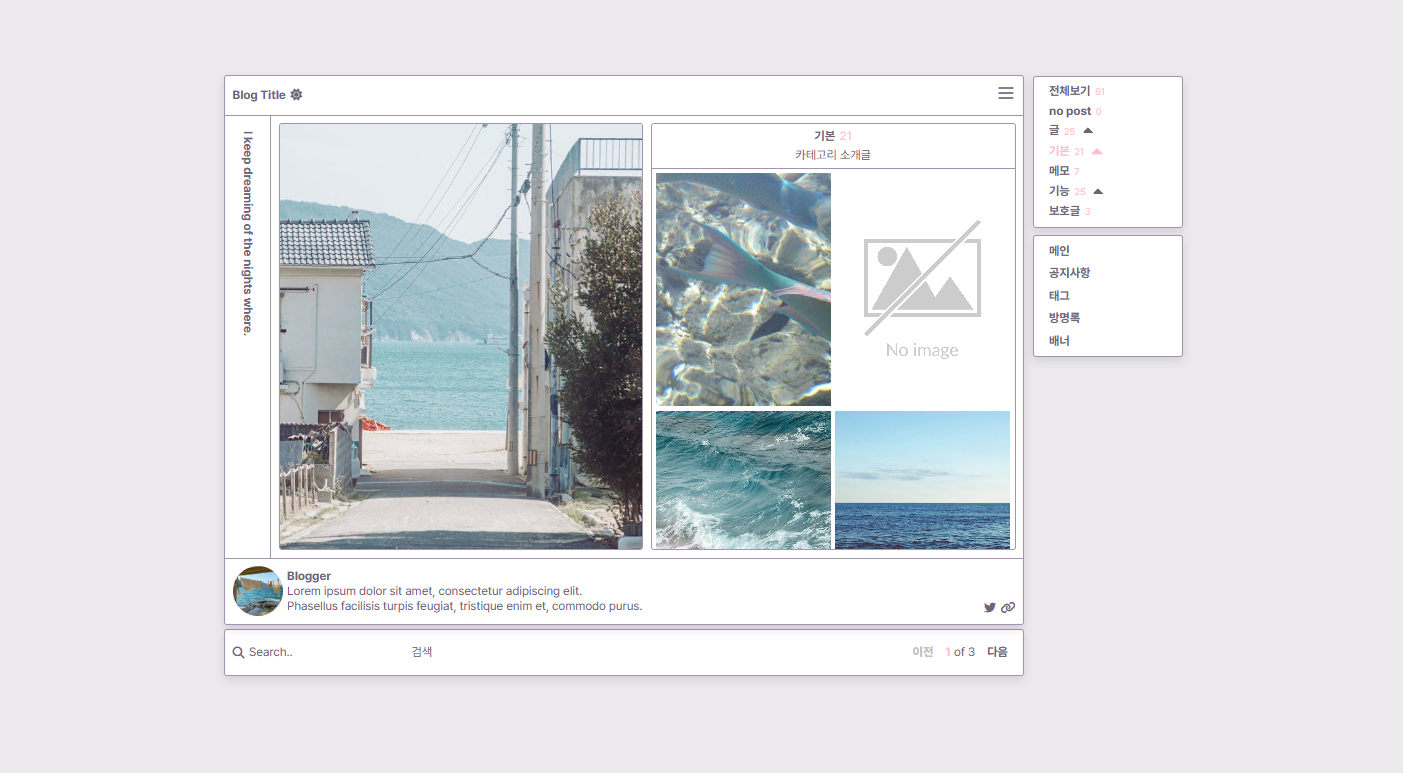 개인적으로 좋아하는 취향을 담아 티스토리 스킨을 제작합니다 ꒰՞⸝⸝•̀𖥦•́꒱و ̖́-♡