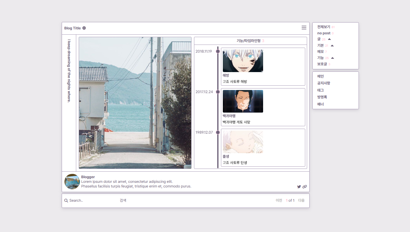 개인적으로 좋아하는 취향을 담아 티스토리 스킨을 만들고 있습니다. ✧٩(•́⌄•́๑)و ✧ 이미지 많이 넣기, 이것저것 정신없이 모아놓기, 레트로&빈티지, 보라색, 그리고 고죠 좋아함 등등..(ദ്ദിㆁᴗㆁ♥)