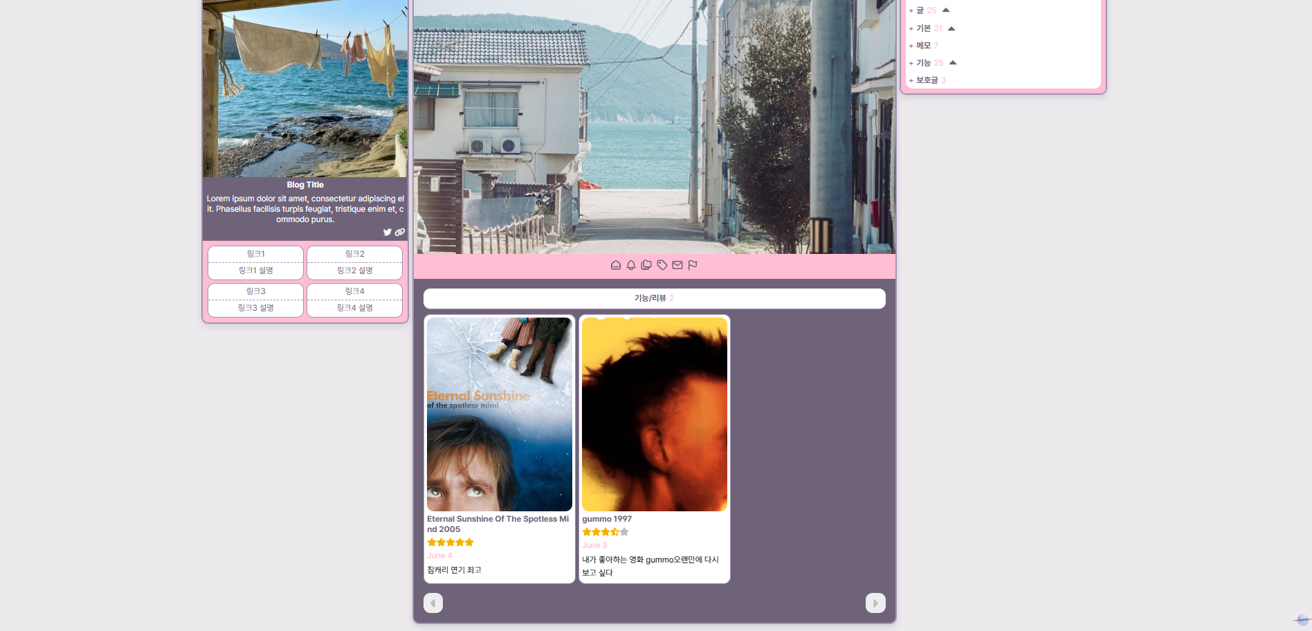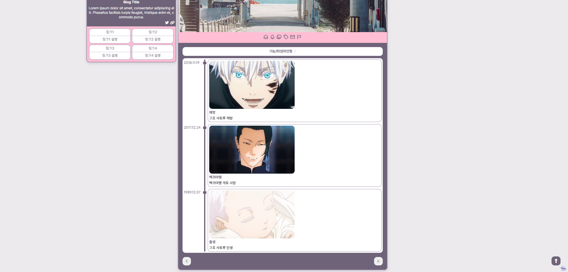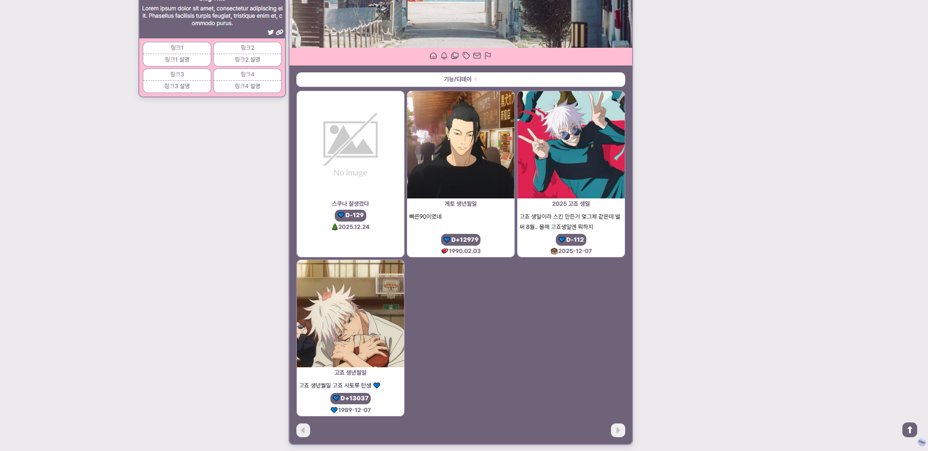 개인적으로 좋아하는 취향을 담아 티스토리 스킨을 만들고 있습니다. ✧٩(•́⌄•́๑)و ✧ 이미지 많이 넣기, 이것저것 정신없이 모아놓기, 레트로&빈티지, 보라색, 그리고 고죠 좋아함 등등..(ദ്ദിㆁᴗㆁ♥)