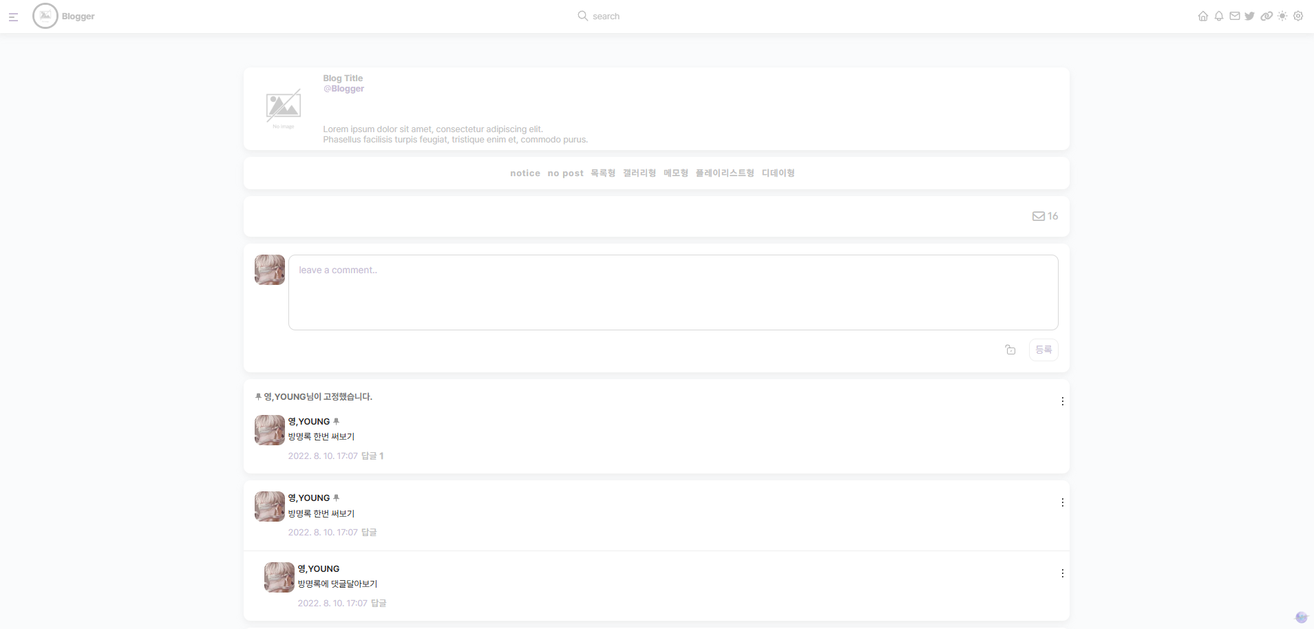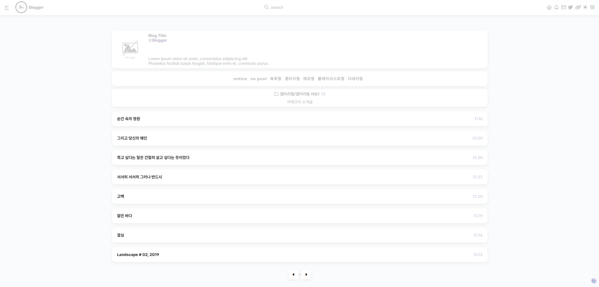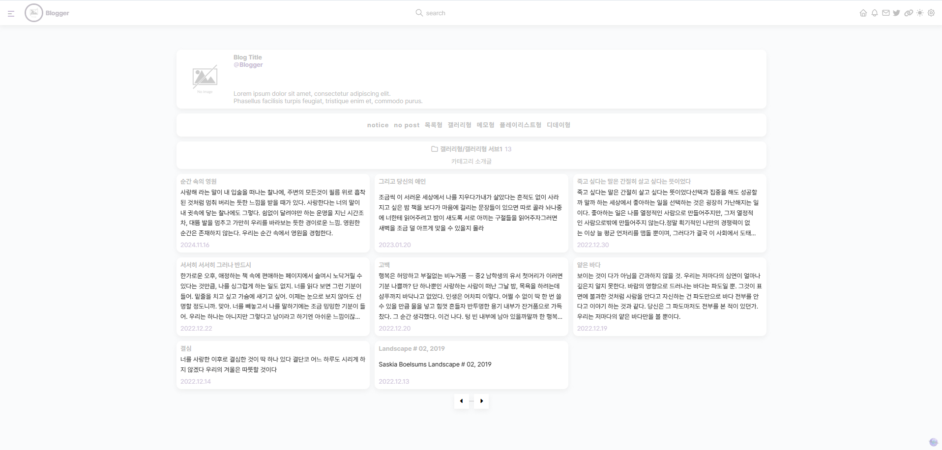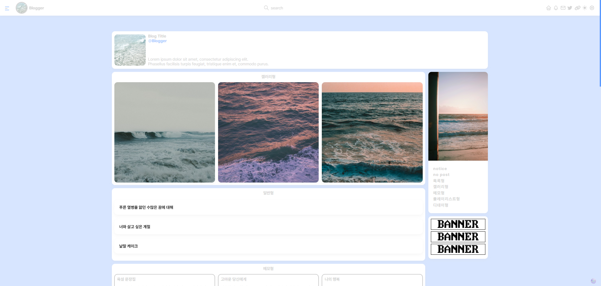 메모형 홈커버 및 게시판은 24.11.04(스킨 36~)부터 추가 됩니다. * 이 외 스킨 제작시 새로운 게시판 유형이 추가 될 수 있습니다.
