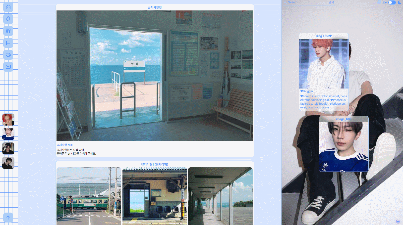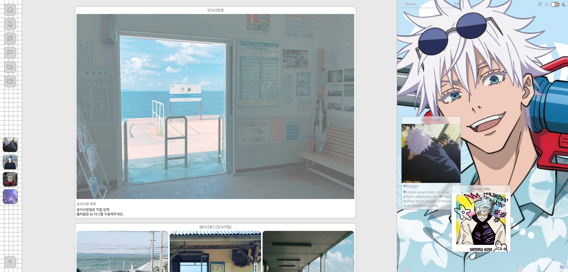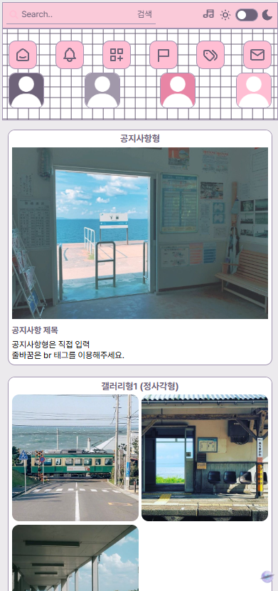 메모형 홈커버 및 게시판은 24.11.04(스킨 36~)부터 추가 됩니다. * 이 외 스킨 제작시 새로운 게시판 유형이 추가 될 수 있습니다.