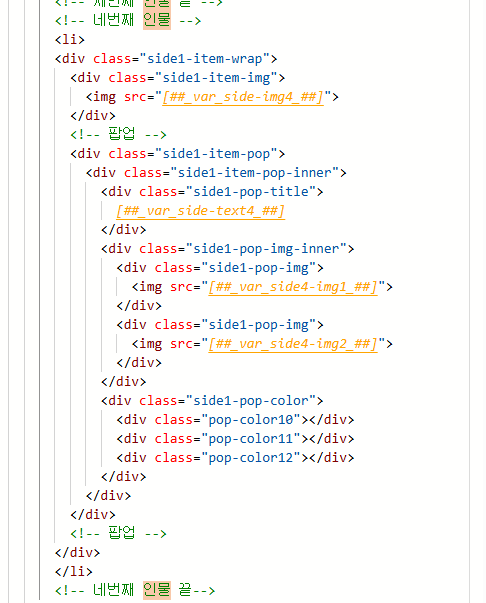 - <!-- 네번째 인물 --> ~ <!-- 네번째 인물 끝 --> 까지 복사 후 네번째 인물 끝 밑에 붙여넣기, 이미지 주소(img src="var_side-img4" , side4-img1, side4-img2) 및 텍스트(side-text4) 수정해주세요!