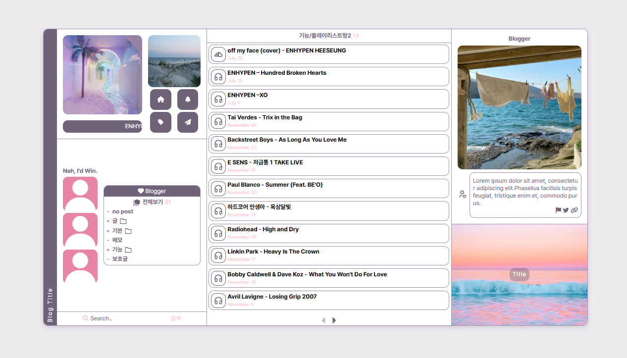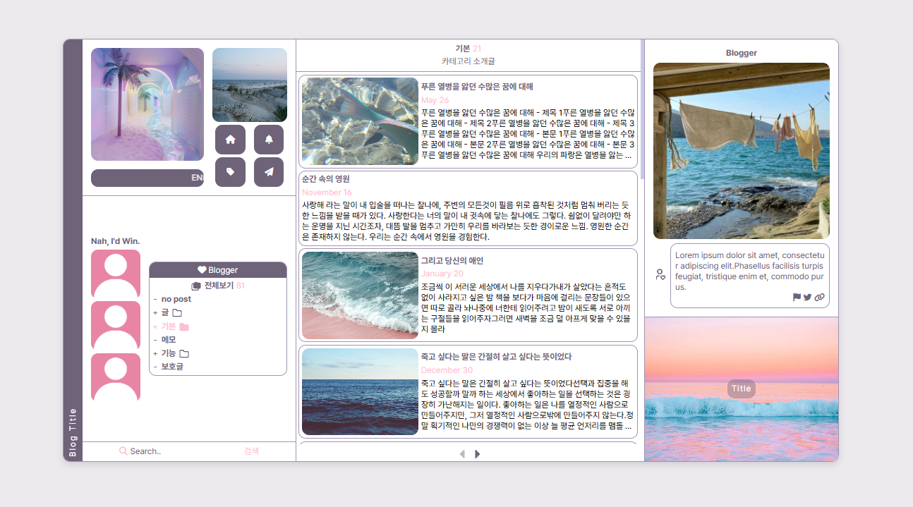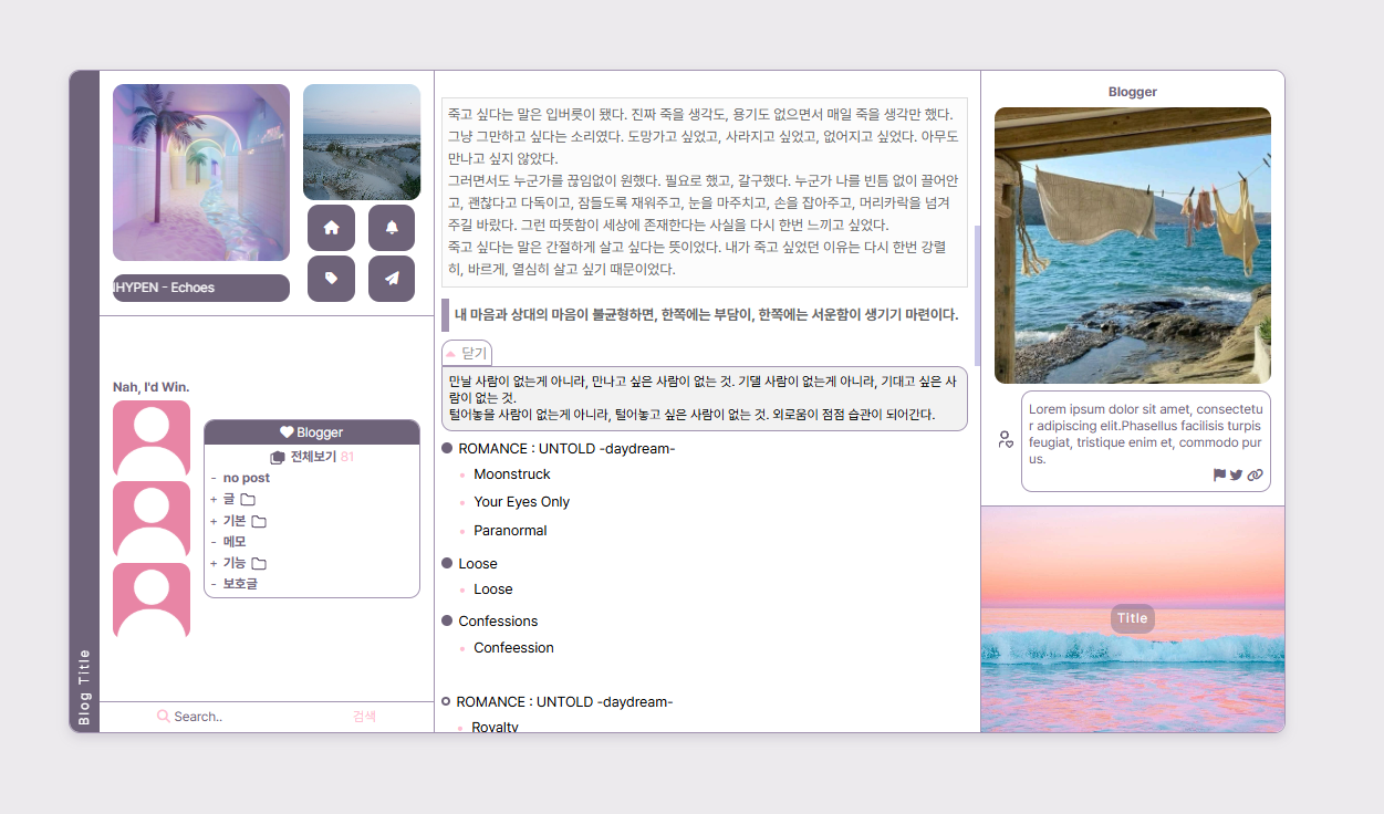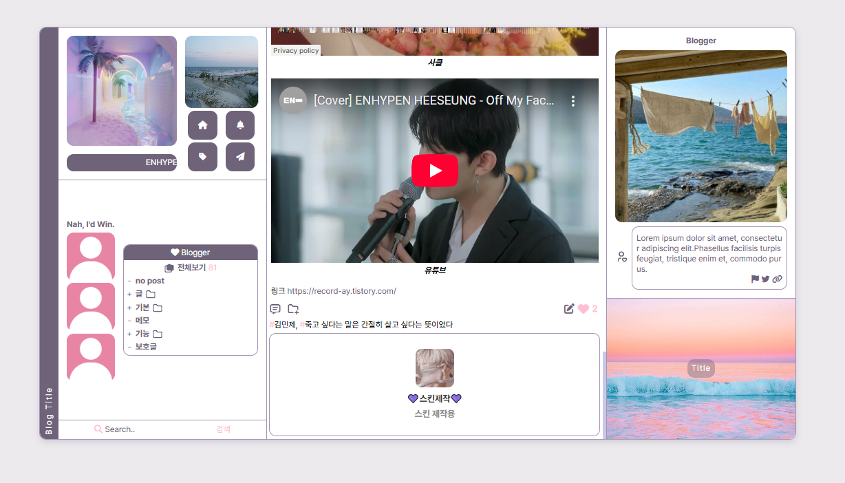 개인적으로 좋아하는 취향을 담아 티스토리 스킨을 제작합니다 ꒰՞⸝⸝•̀𖥦•́꒱و ̖́-♡