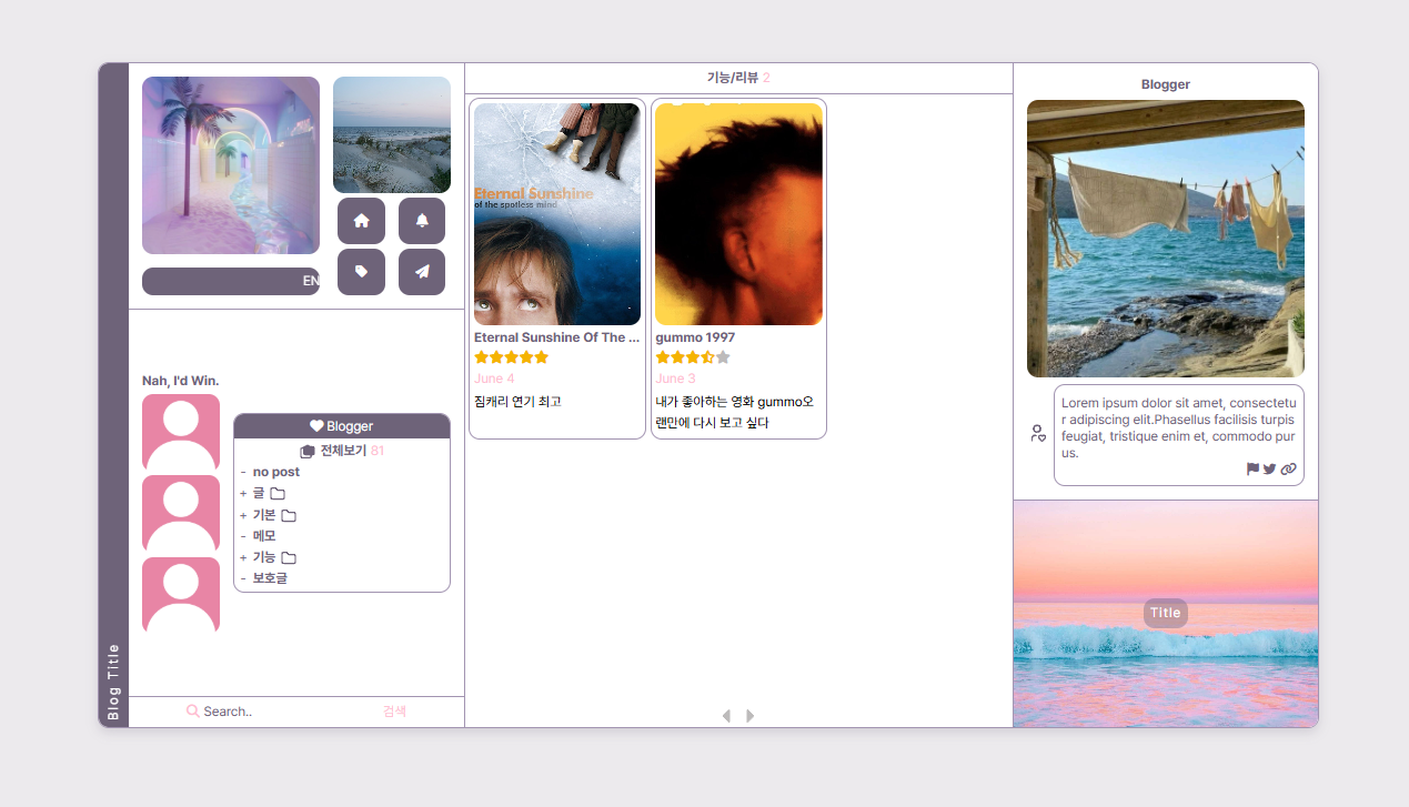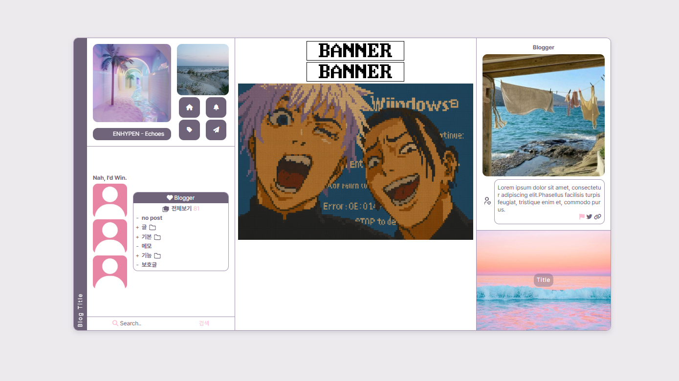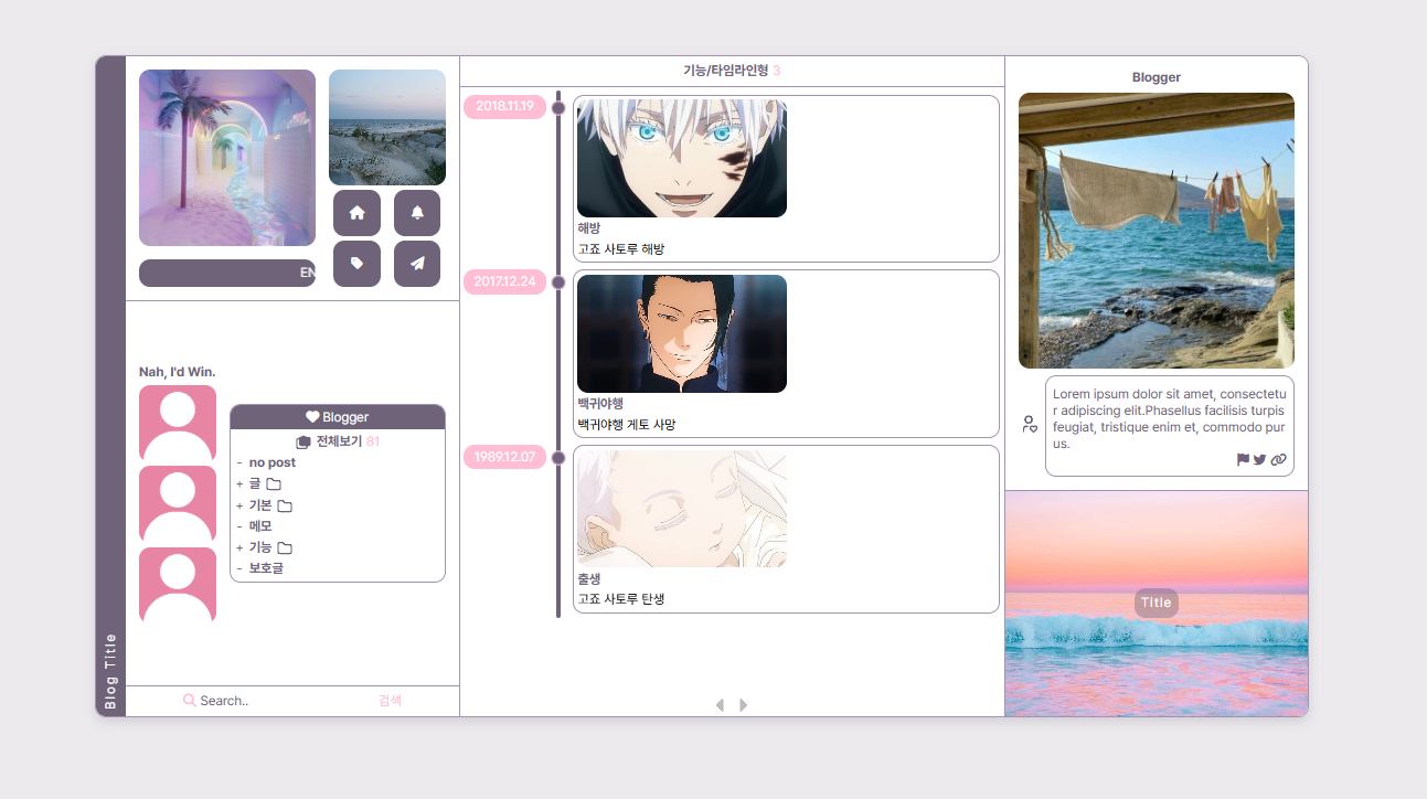 개인적으로 좋아하는 취향을 담아 티스토리 스킨을 만들고 있습니다. ✧٩(•́⌄•́๑)و ✧ 이미지 많이 넣기, 이것저것 정신없이 모아놓기, 레트로&빈티지, 보라색, 그리고 고죠 좋아함 등등..(ദ്ദിㆁᴗㆁ♥)