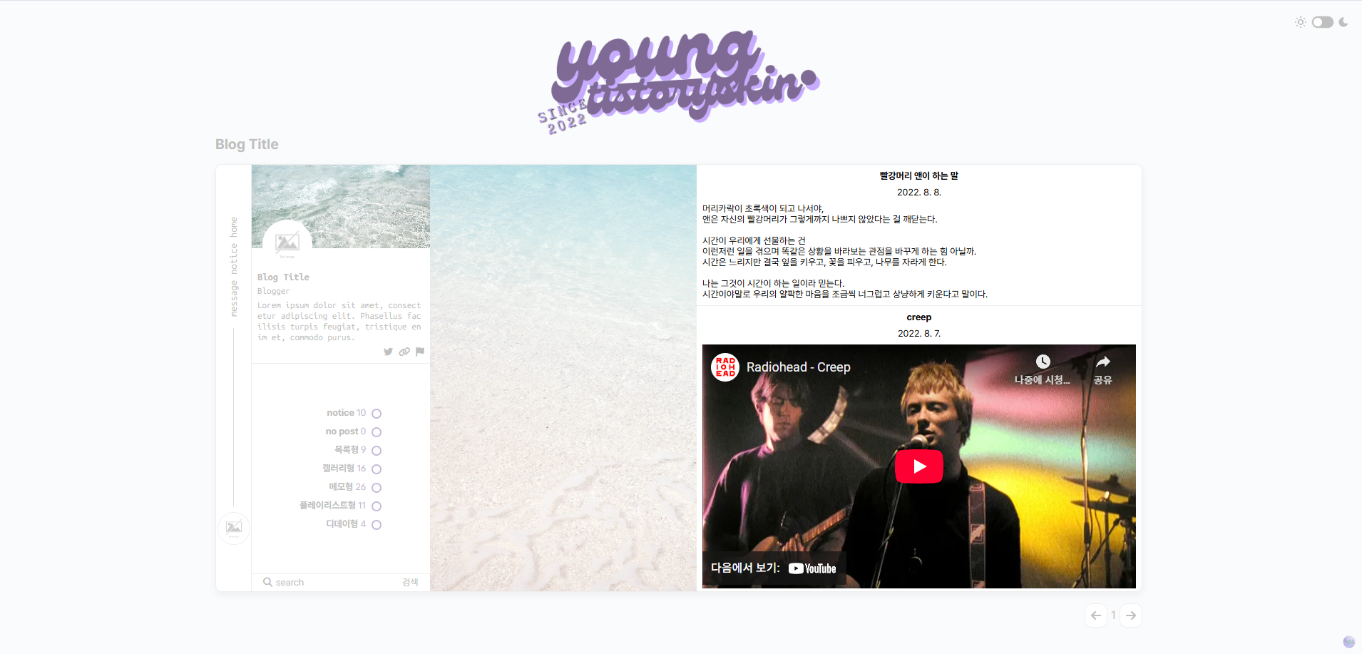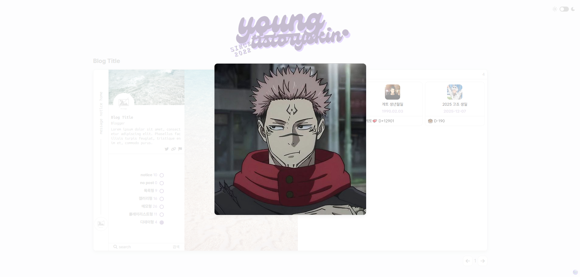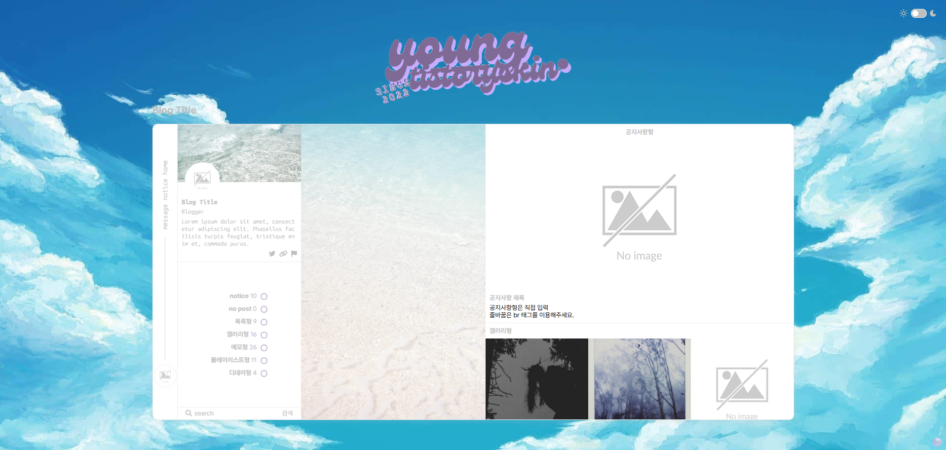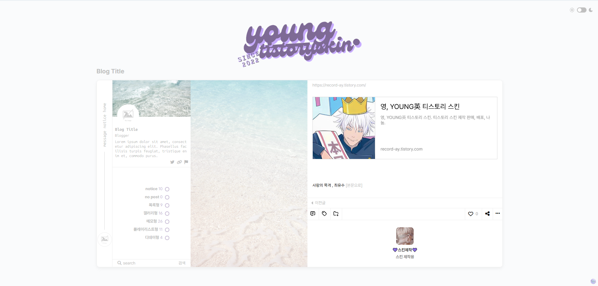 개인적으로 좋아하는 취향을 담아 티스토리 스킨을 제작합니다 ꒰՞⸝⸝•̀𖥦•́꒱و ̖́-♡