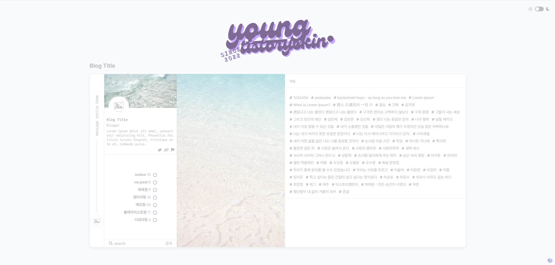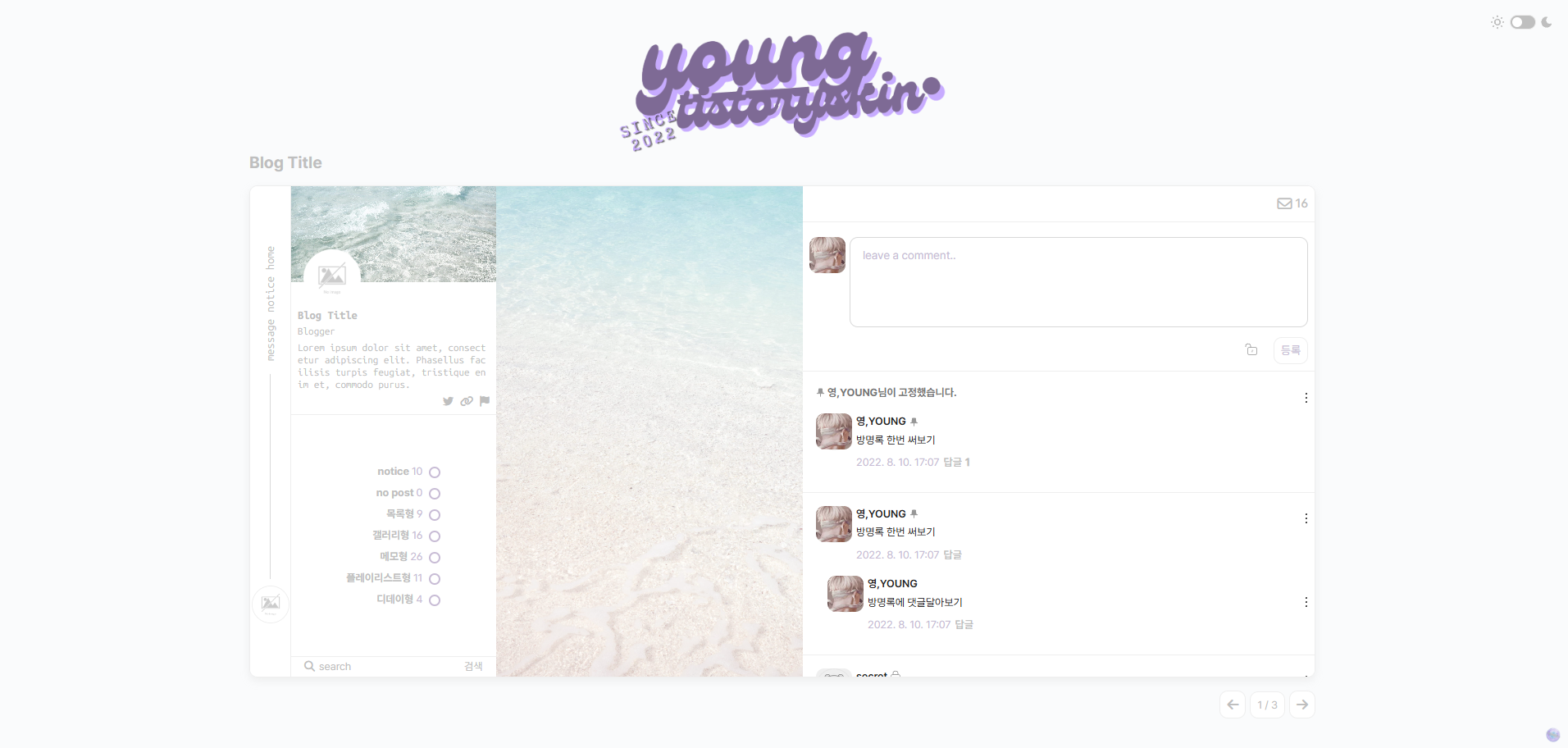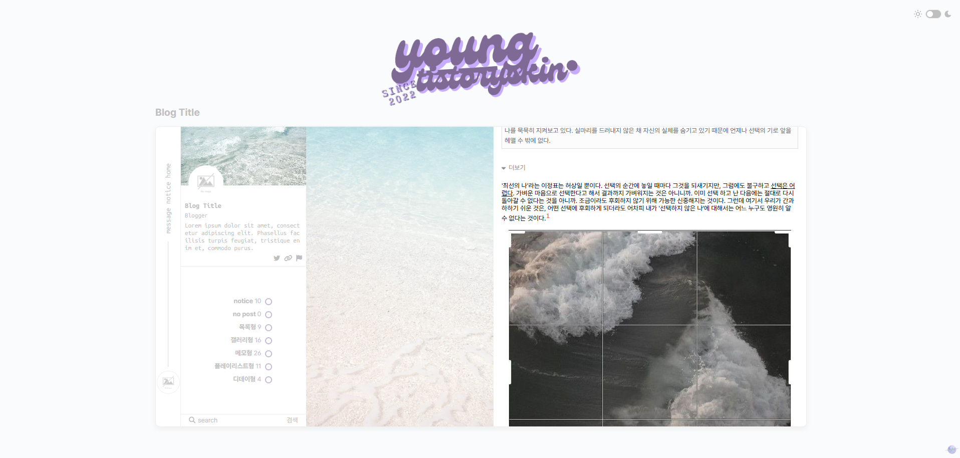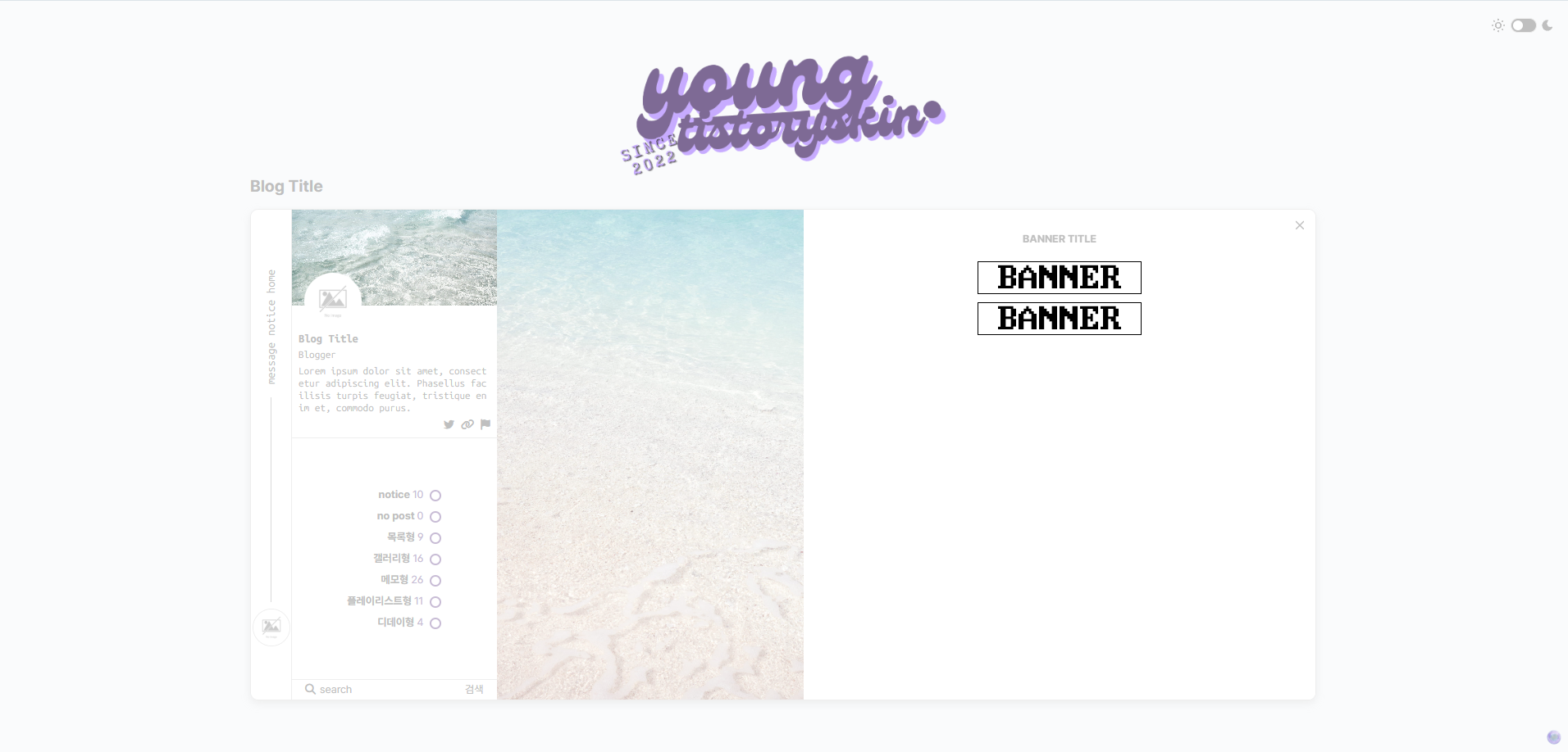 개인적으로 좋아하는 취향을 담아 티스토리 스킨을 제작합니다 ꒰՞⸝⸝•̀𖥦•́꒱و ̖́-♡