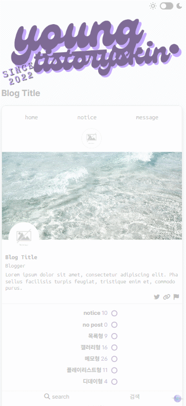 - 기본 포인트 색상 및 이미지 변경 - 폰트 사이즈, 테두리 둥그리 및 행간 스킨편집창에서 수정 가능하도록 추가 - 갤러리/디데이형 게시판 레리아웃(한줄당 n개) 스킨 편집창에서 수정 가능하도록 추가 - 라이트모드, 다크모드 추가 (+프로필, 배경이미지 함께 변경) - 레이아웃(디자인) 코드 수정 - 목록형, 요약형 커버 디자인 변경 - 메모형, 디데이형 게시판 추가 - 배너 영역 추가 - 배경이미지, 로고 추가 (사용/미사용 스킨편집창에서 수정 가능) - 카테고리 우측 원형 아이콘 디자인 수정 - 반응형 카테고리 디자인 변경 (햄버거 메뉴 → pc와 동일 디자인)
