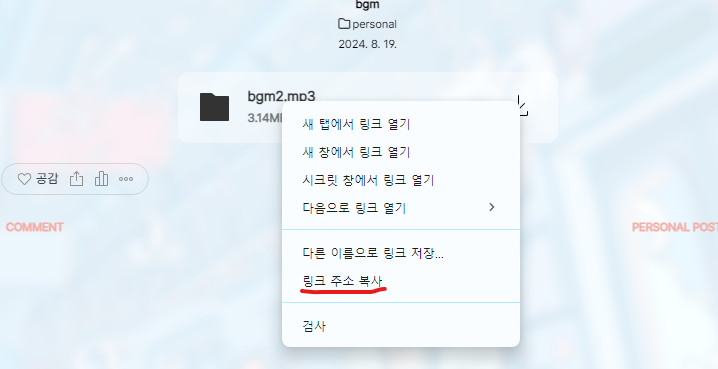 오른쪽 마우스 > 링크주소 복사 클릭