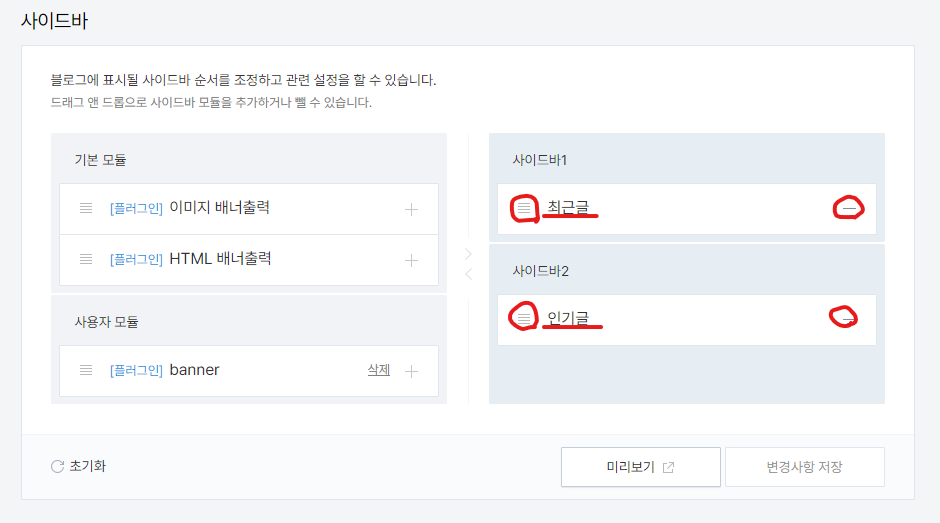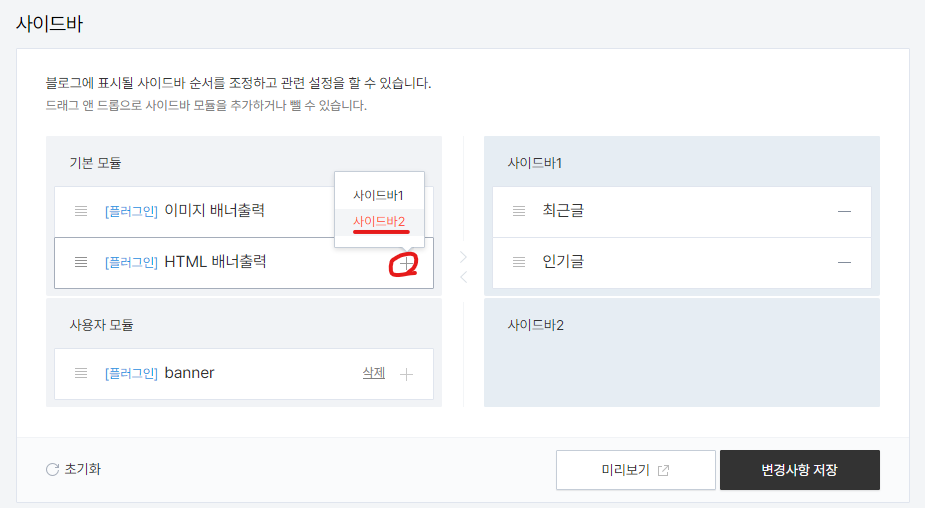 3. 테스트는 최근글 , 인기글을 사이드바1에 넣은 후 2에 배너를 넣겠습니다.
