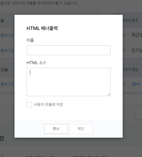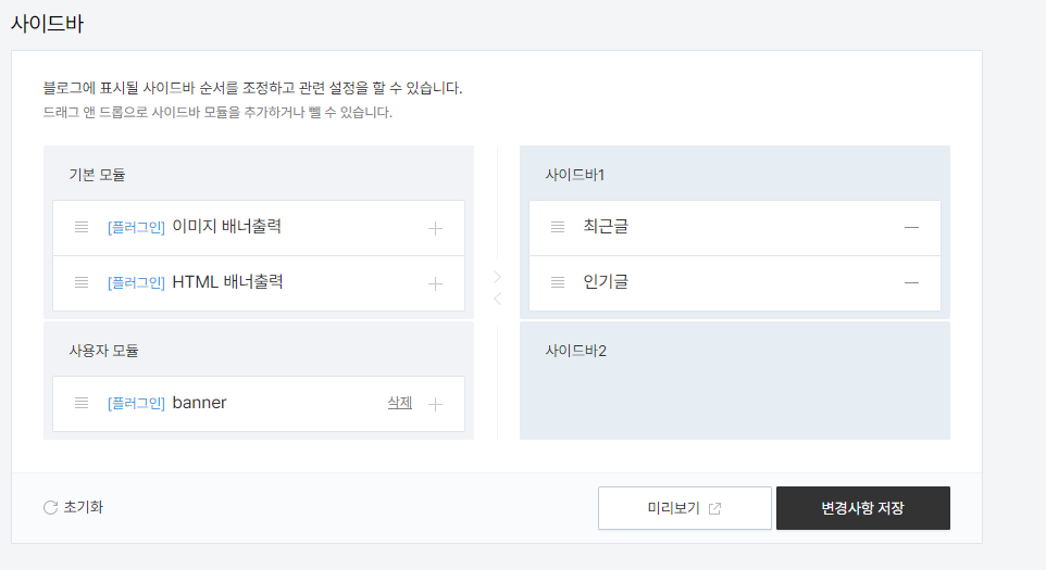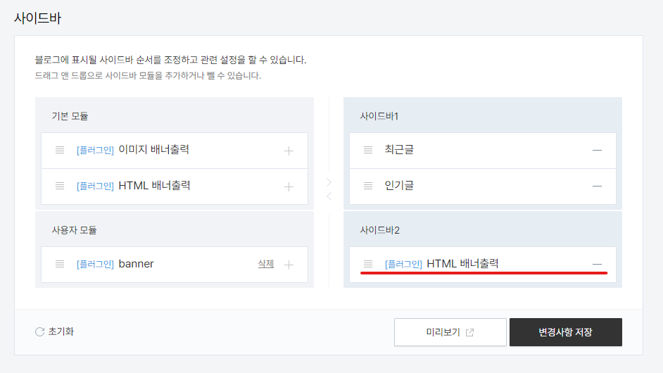 (사이드바 1,2 모두 배너를 넣으시려면 - 를 누르신 후 최근글, 인기글을 삭제해주시면 됩니다.)