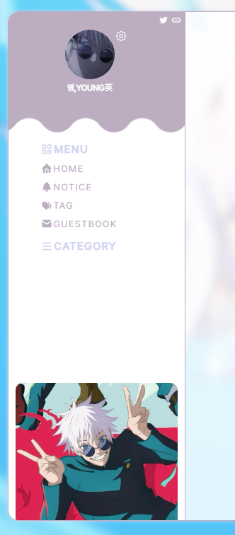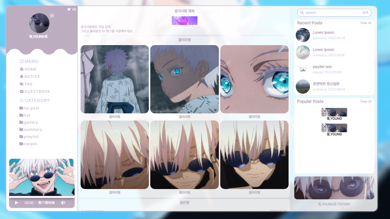 개인적으로 좋아하는 취향을 담아 티스토리 스킨을 만들고 있습니다. ✧٩(•́⌄•́๑)و ✧ 이미지 많이 넣기, 이것저것 정신없이 모아놓기, 레트로&빈티지, 보라색, 그리고 고죠 좋아함 등등..(ദ്ദിㆁᴗㆁ♥)