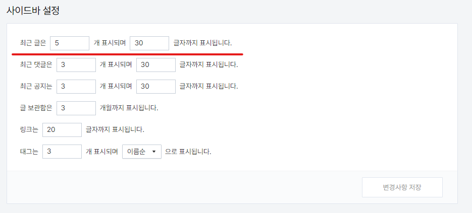 사이드바 제목, 최근글 개수  수정법