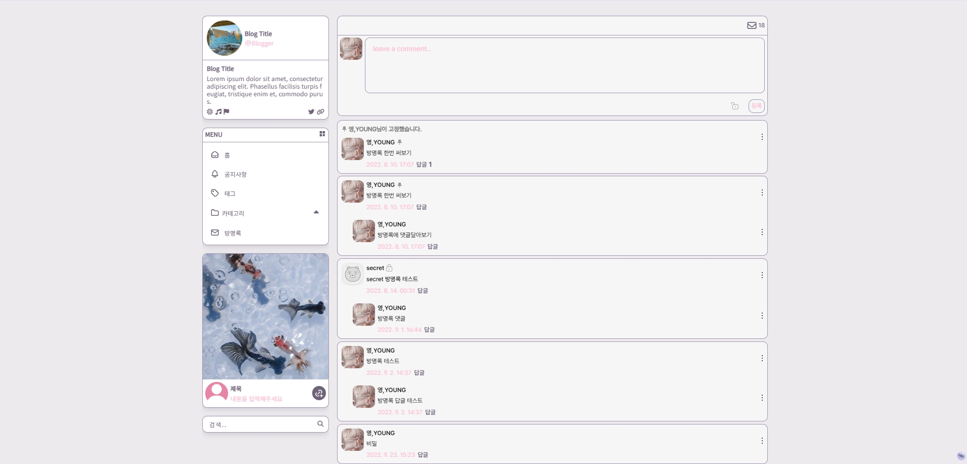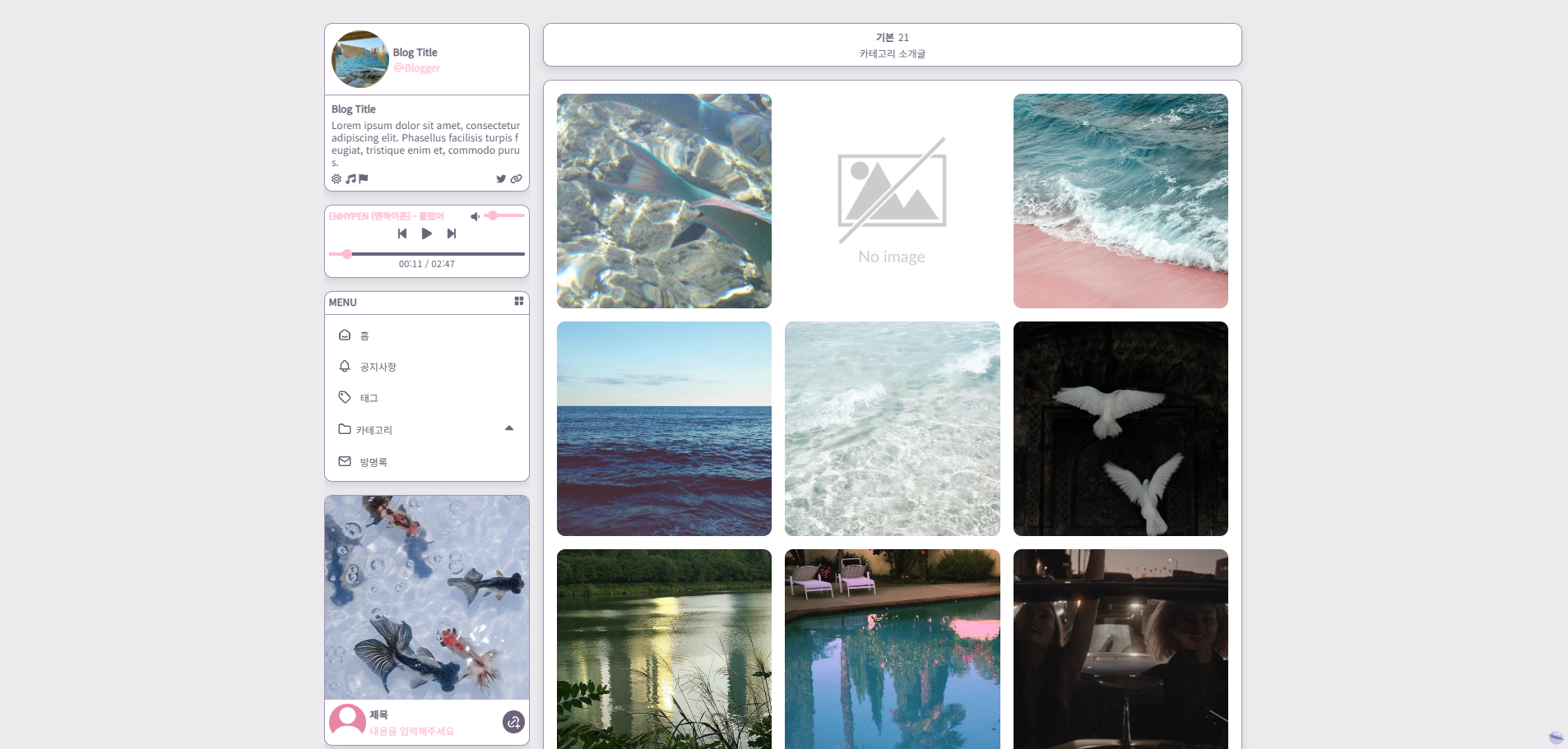 공지사항태그방명록 및 댓글갤러리형 1갤러리형 2갤러리형 3목록형메모형요약형디데이형리뷰형타임라인형투두형플레이리스트형 1플레이리스트형 2플레이리스트형 2본문본문