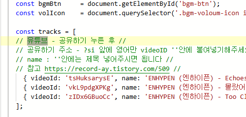 * 유튜브 주소 사용 * 페이지 이동시 끊긴 부분 부터 재생 * 배경음악 재생시 아이콘이 반짝 거립니다!_! * 스킨편집하기 - html - ctrl+f(찾기) - 유튜브 검색 후 videoId: ''안을 수정해주세요. (방법은 스킨편집창에 있는 본문 주소 참고해주시면 됩니다)