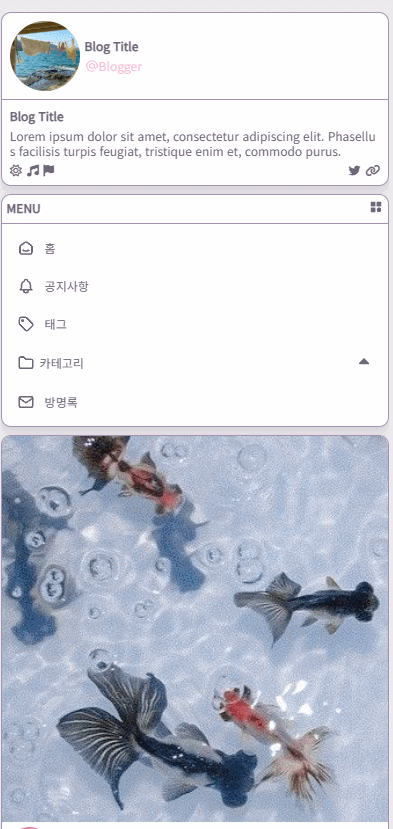스킨 적용 기본 색상 및 홈커버 (테두리 사용)테투리 미사용 (스킨편집창에서 설정)다크모드 / 배경음악 / 카테고리 / 홈커버