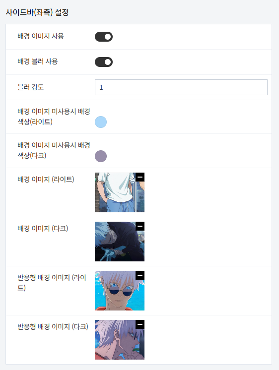 * 사이드바 배경이미지는 스킨편집창에서 수정 * 배경이미지 사용/미사용, 블러 사용/미사용 선택 * 이미지 미사용시 색상(단색) 선택 가능