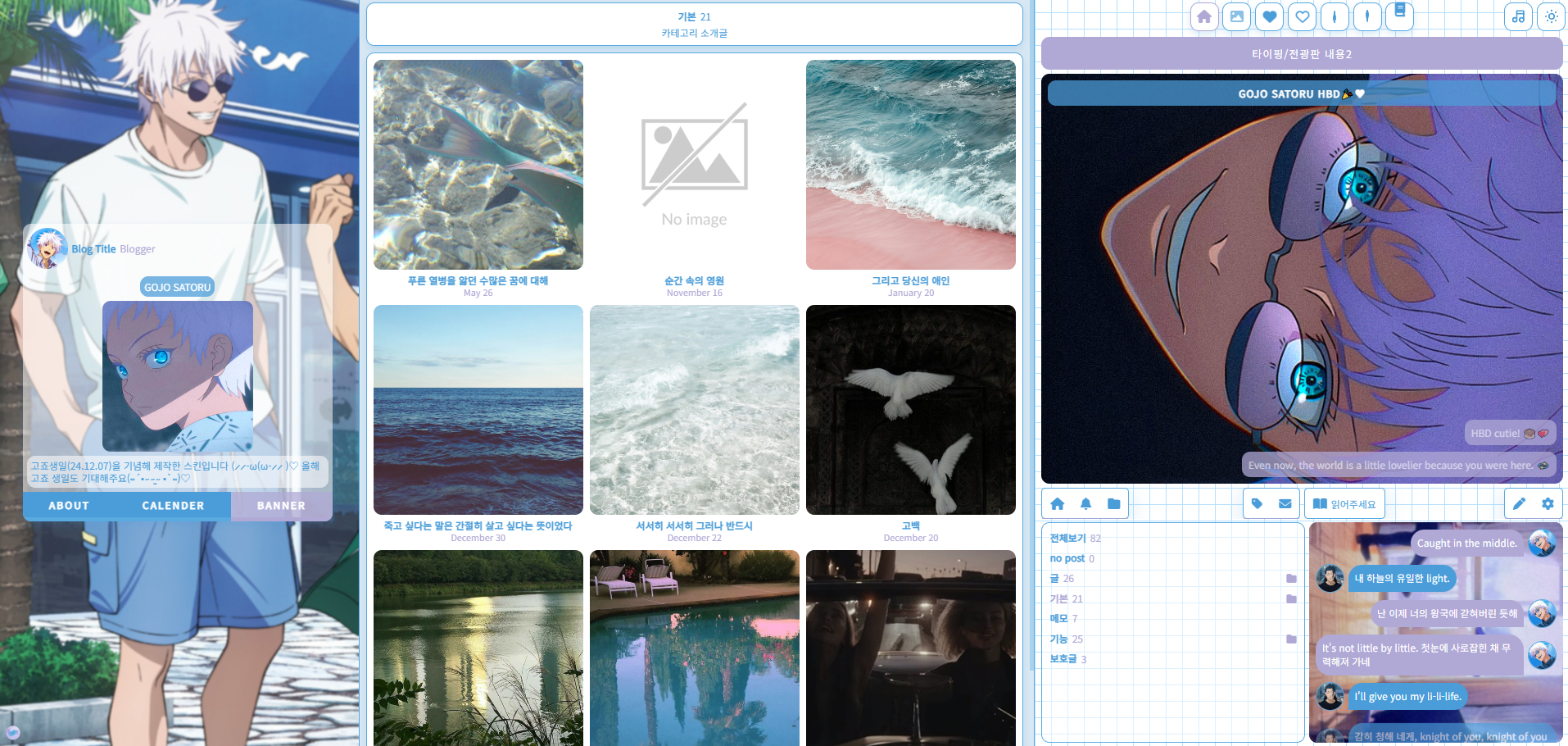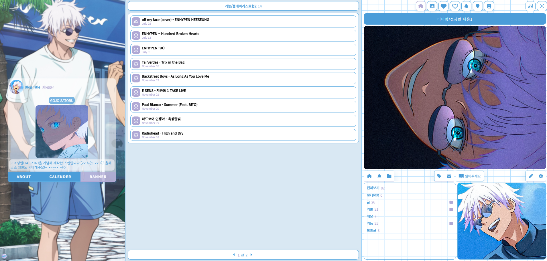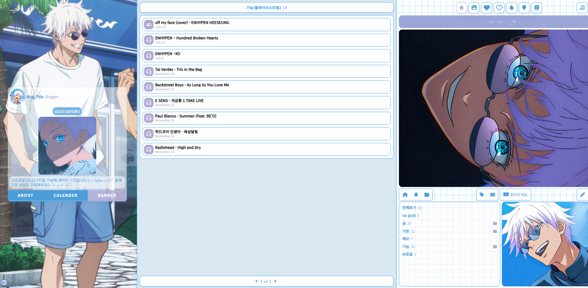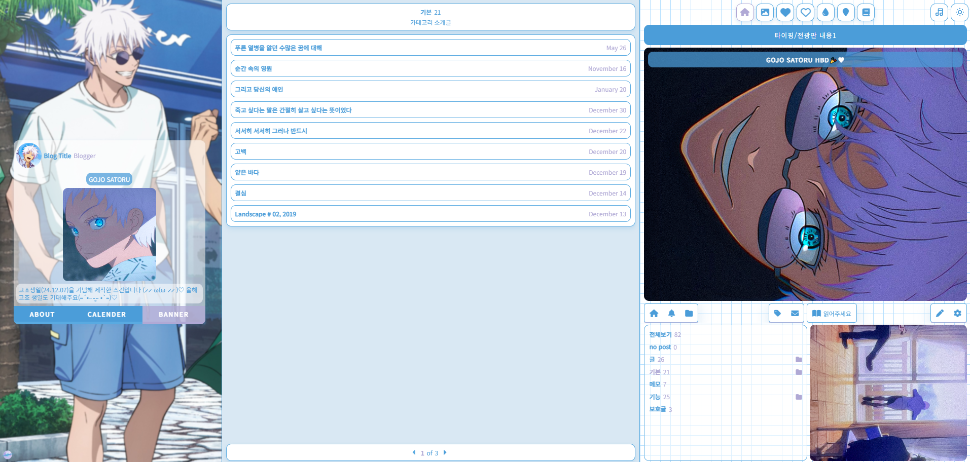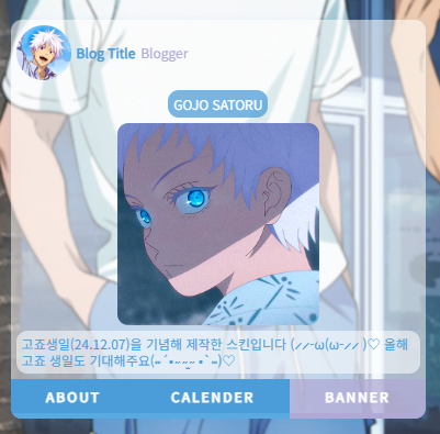 + 이 스킨은 고죠 생일을 기념해서 제작된 스킨이라 기본 이미지와 글 역시 모두 고죠 관련 내용으로 넣어뒀습니다 ʕ•ᴥ•ʔ—♡ (스킨적용시 처음엔 고죠 이미지/글만 보일 수 있으니 참고해주세요)