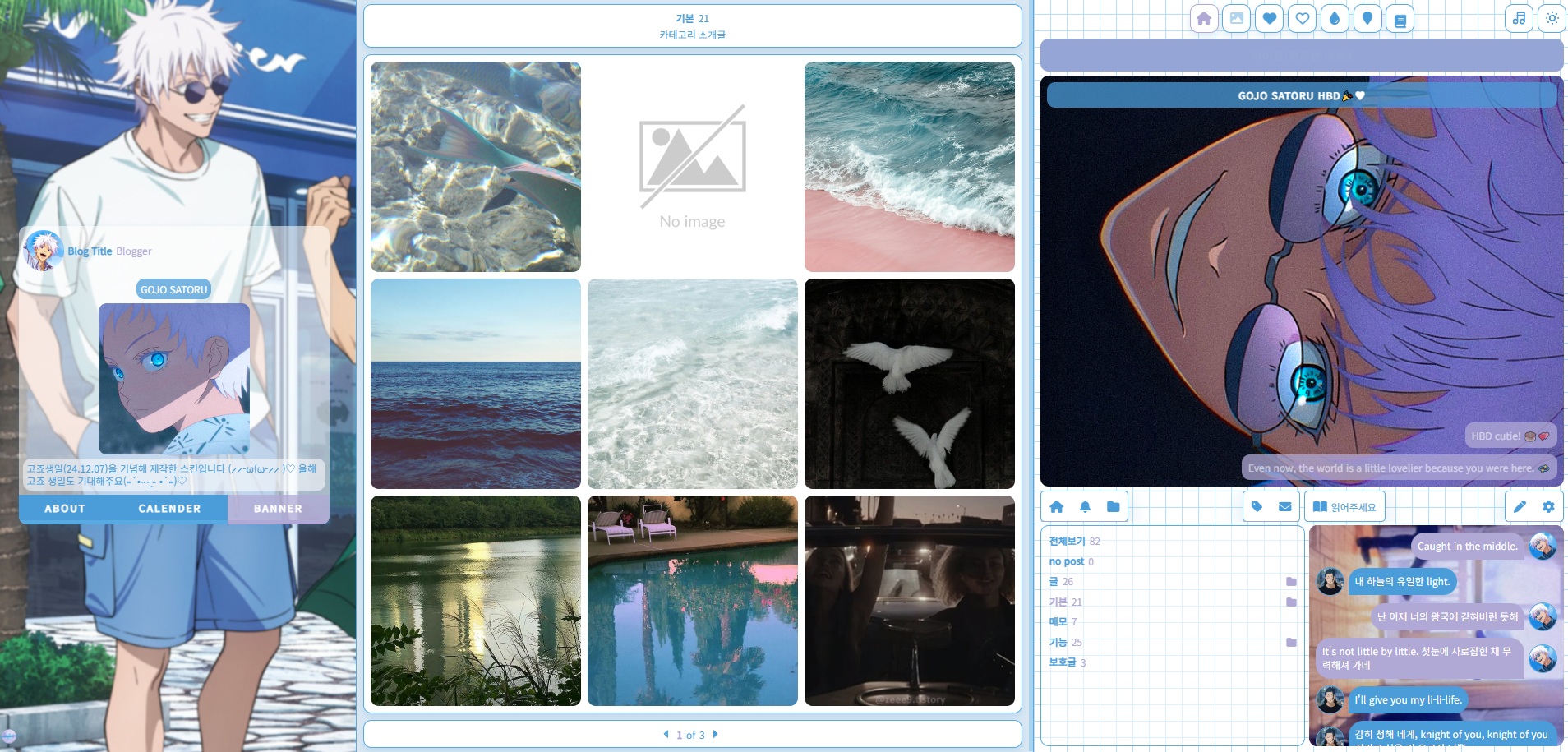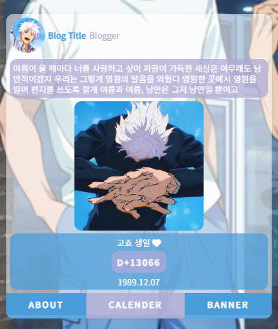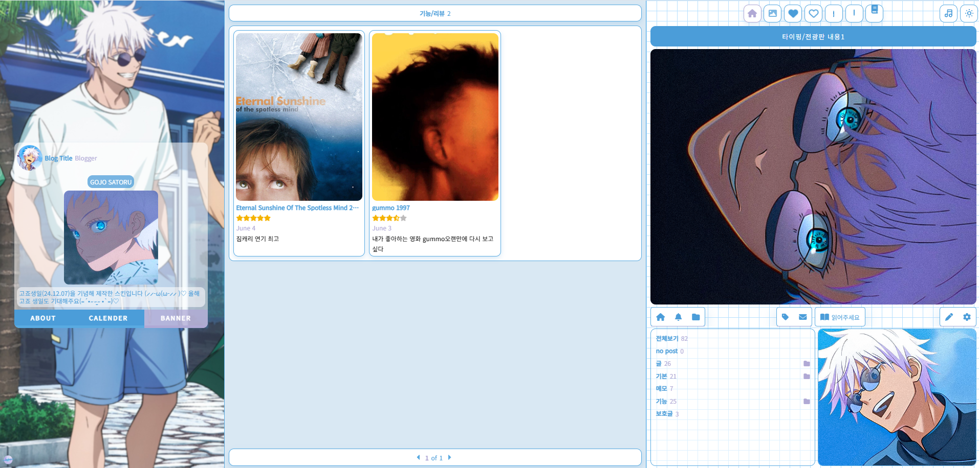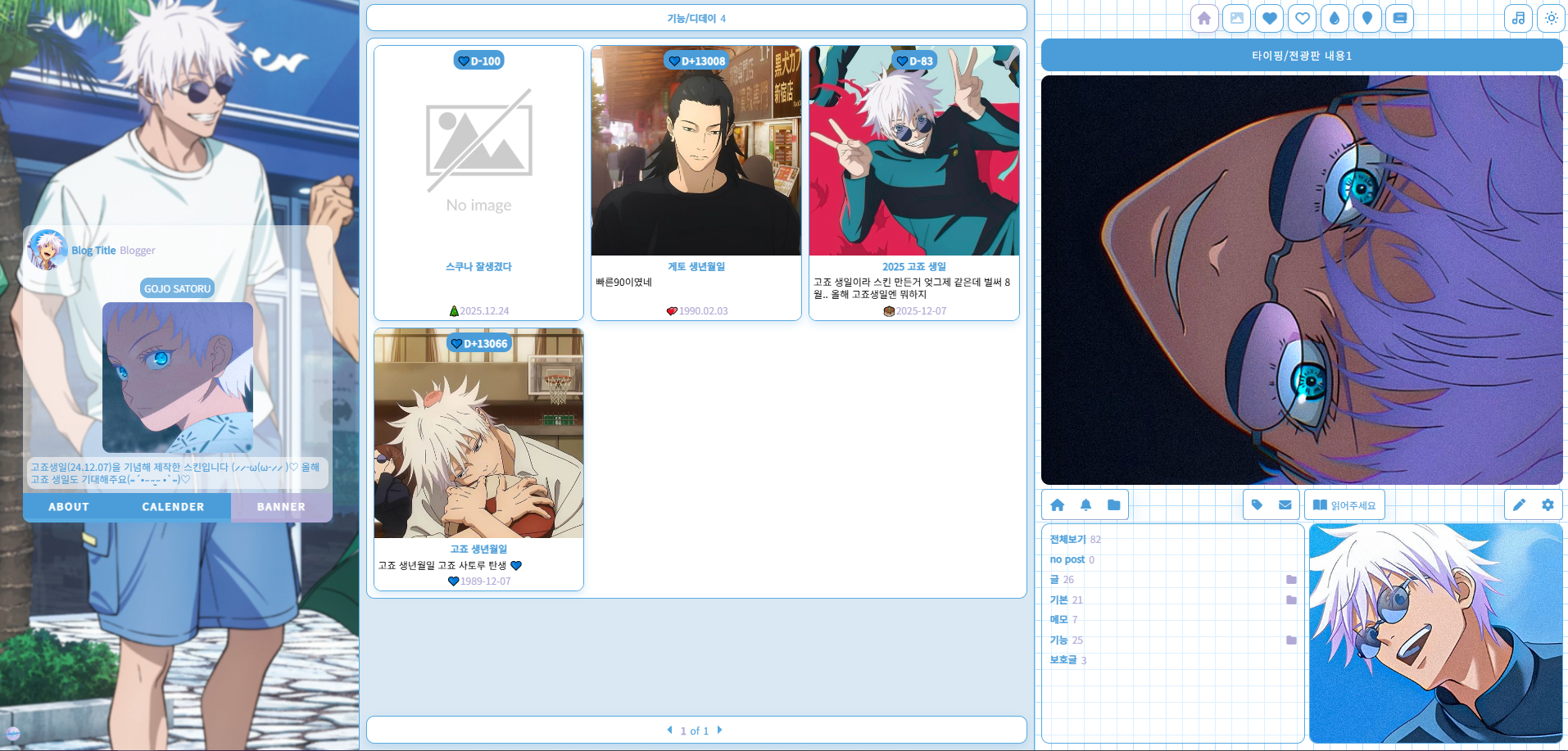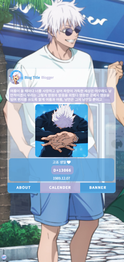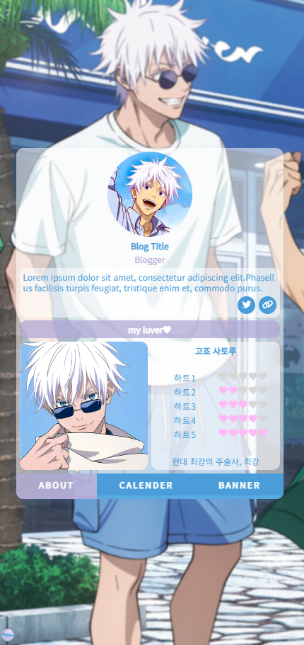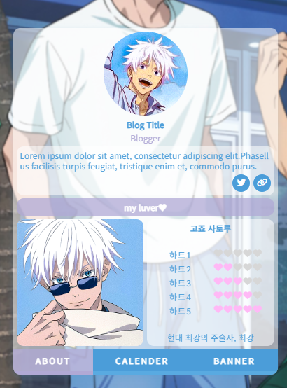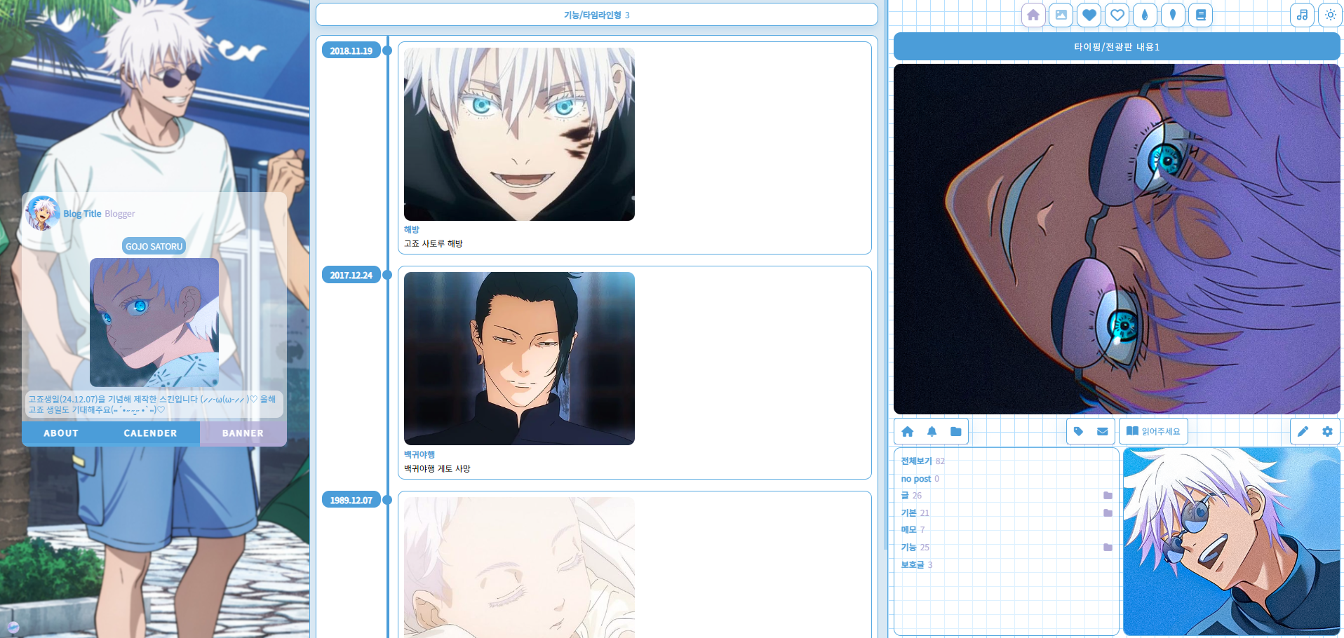 + 이 스킨은 고죠 생일을 기념해서 제작된 스킨이라 기본 이미지와 글 역시 모두 고죠 관련 내용으로 넣어뒀습니다 ʕ•ᴥ•ʔ—♡ (스킨적용시 처음엔 고죠 이미지/글만 보일 수 있으니 참고해주세요)