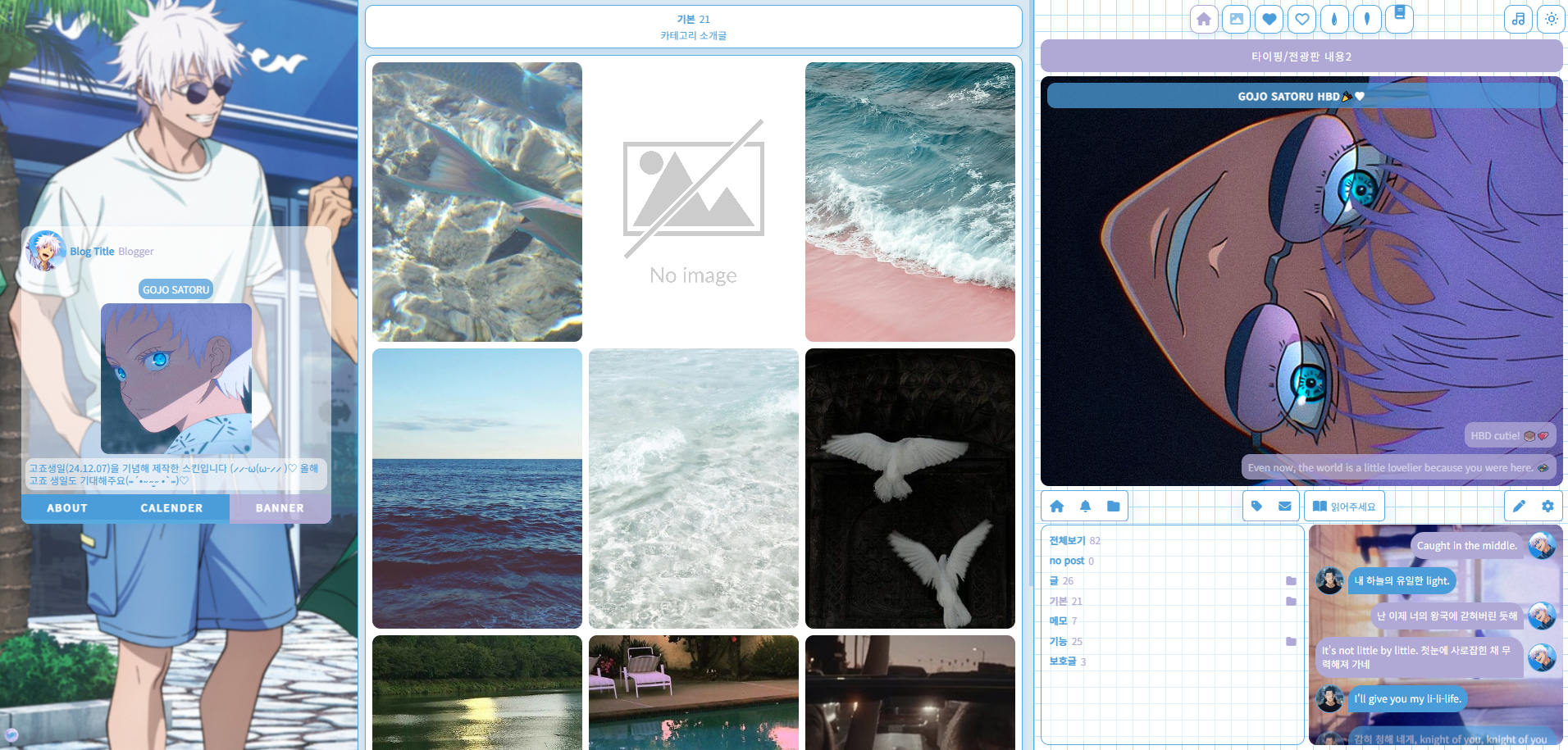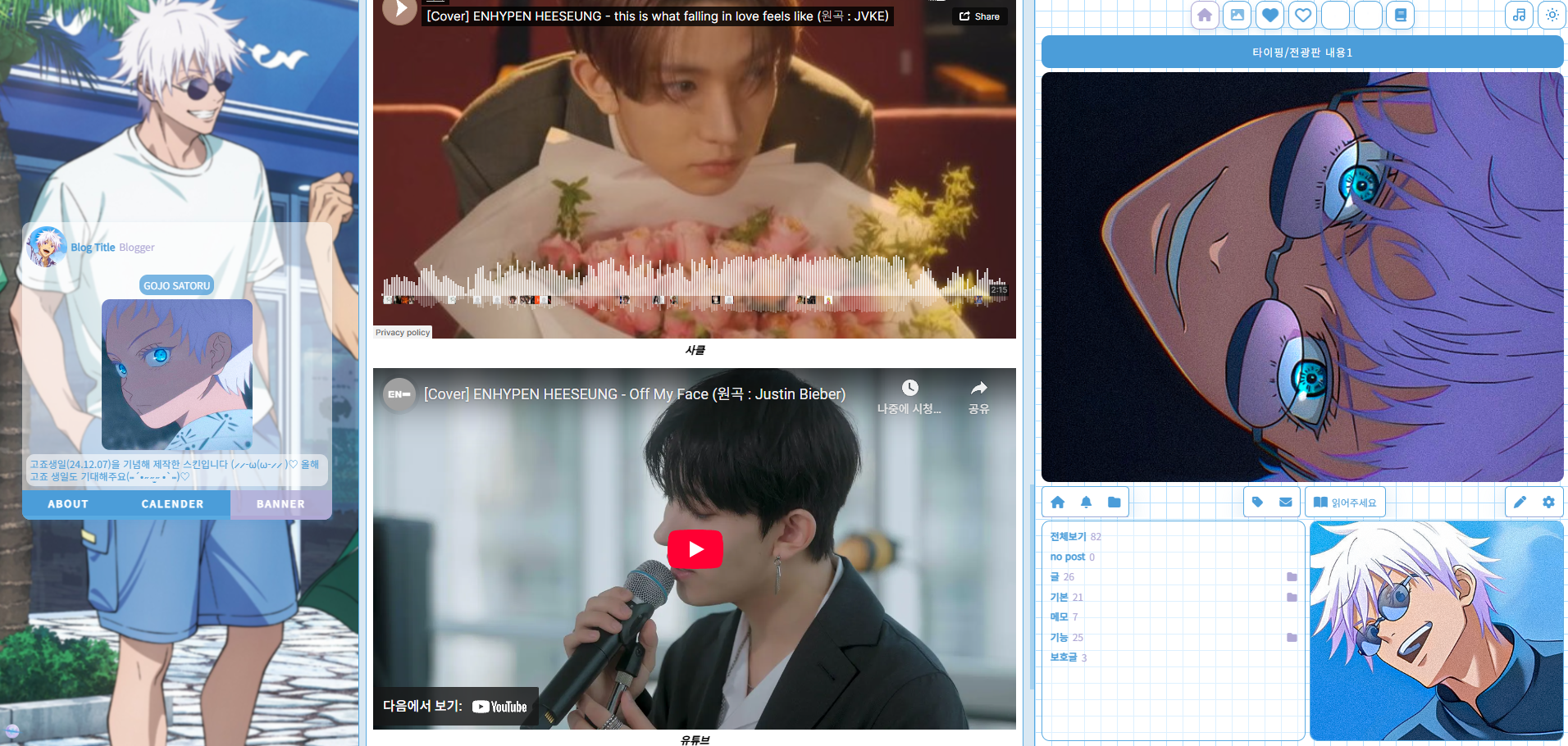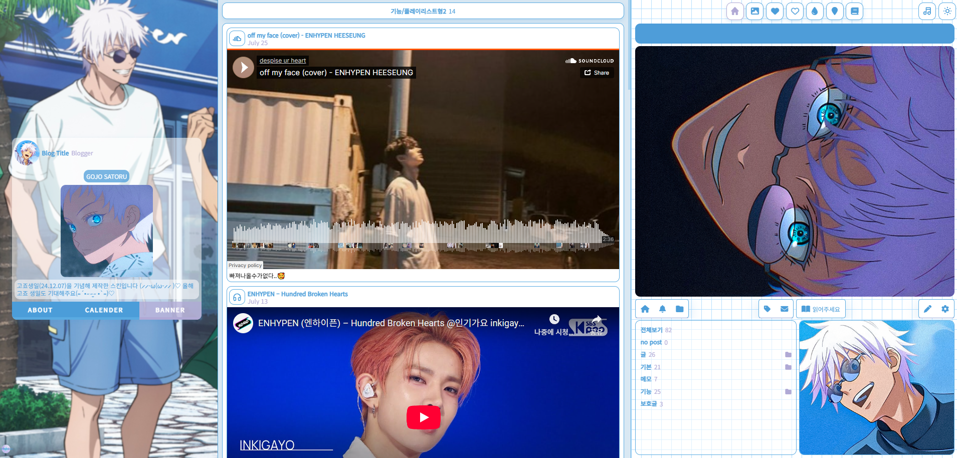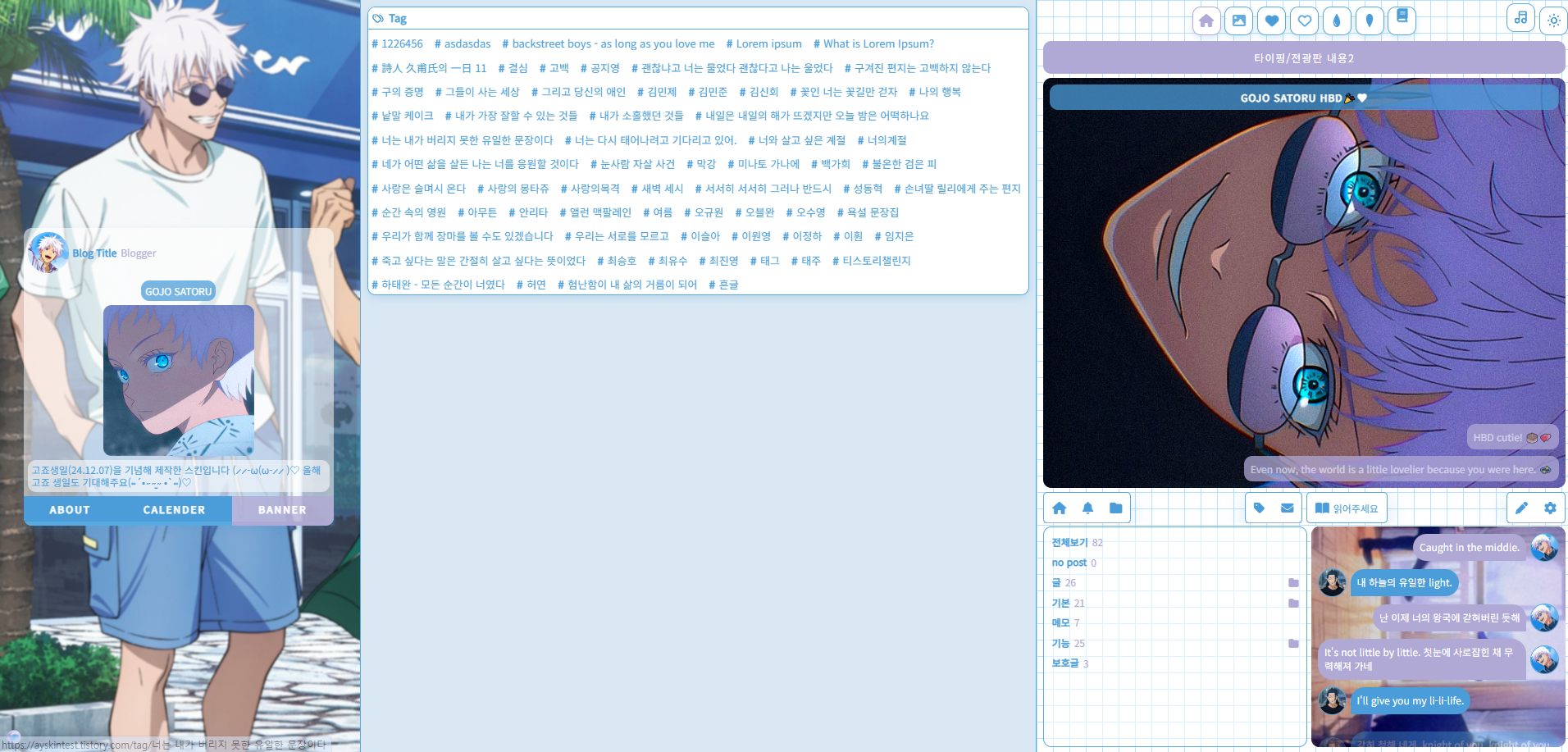 + 이 스킨은 고죠 생일을 기념해서 제작된 스킨이라 기본 이미지와 글 역시 모두 고죠 관련 내용으로 넣어뒀습니다 ʕ•ᴥ•ʔ—♡ (스킨적용시 처음엔 고죠 이미지/글만 보일 수 있으니 참고해주세요)