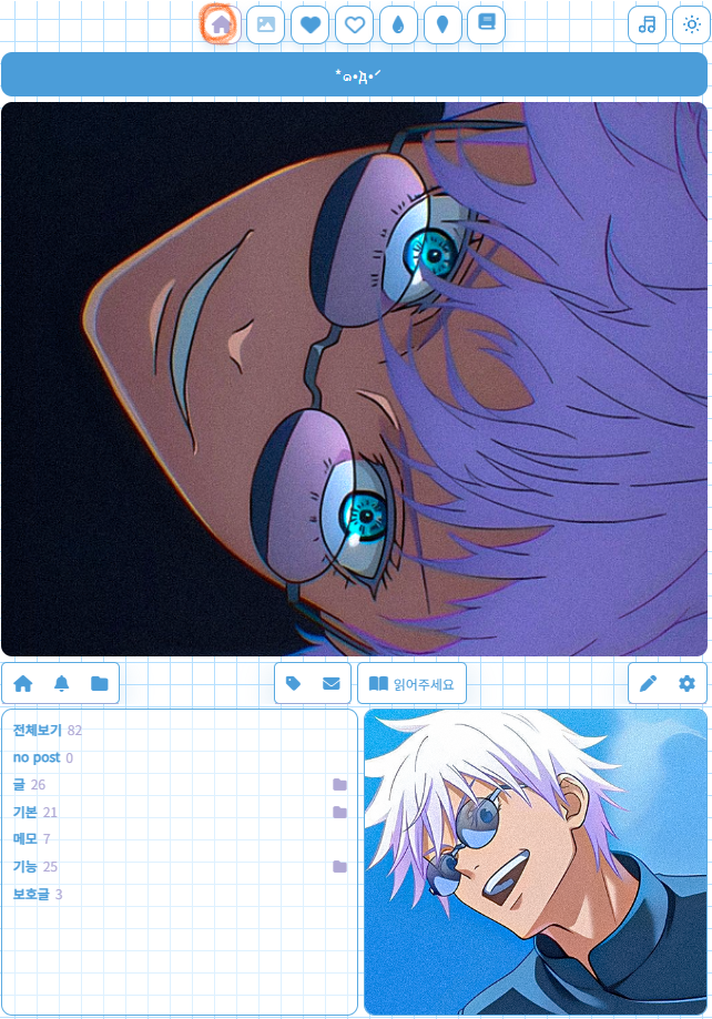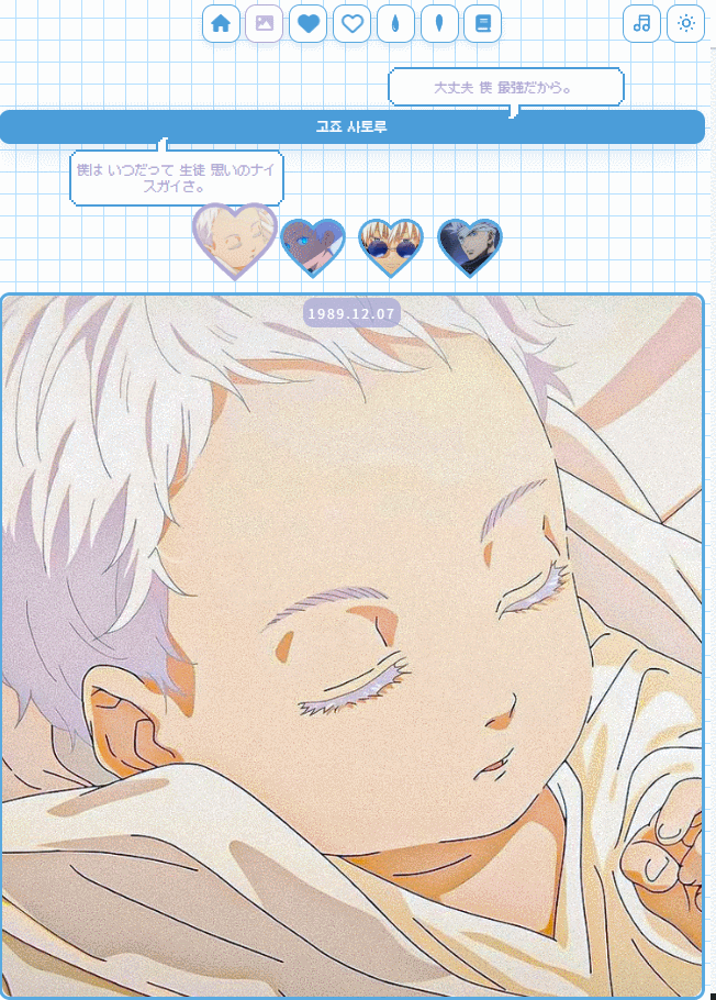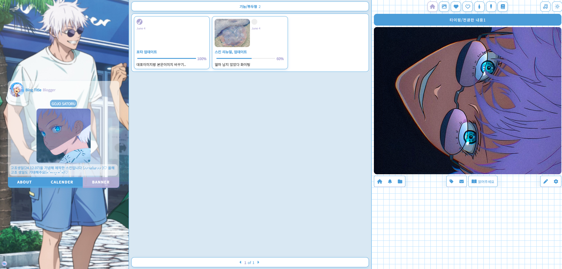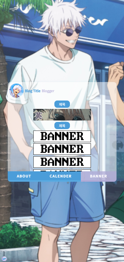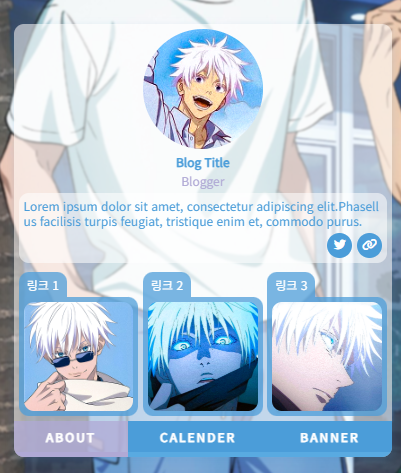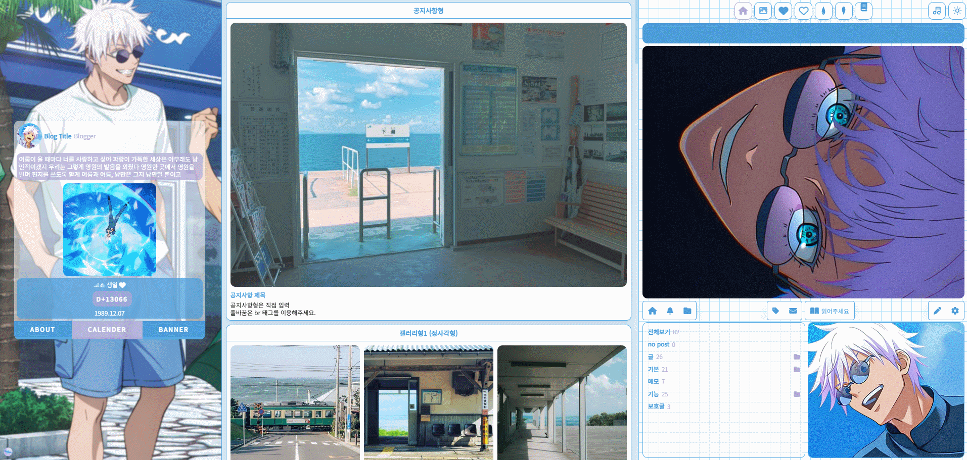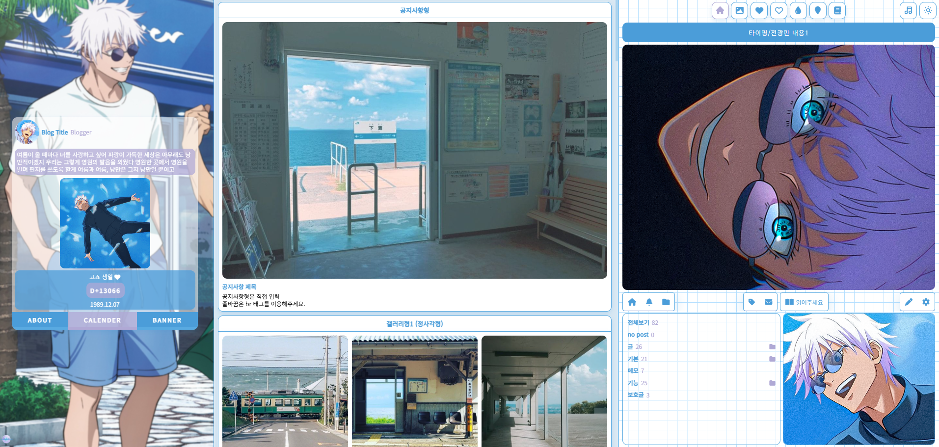+ 이 스킨은 고죠 생일을 기념해서 제작된 스킨이라 기본 이미지와 글 역시 모두 고죠 관련 내용으로 넣어뒀습니다 ʕ•ᴥ•ʔ—♡ (스킨적용시 처음엔 고죠 이미지/글만 보일 수 있으니 참고해주세요)