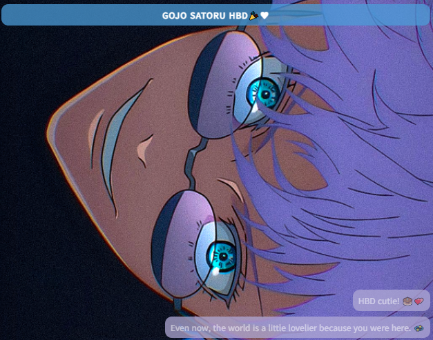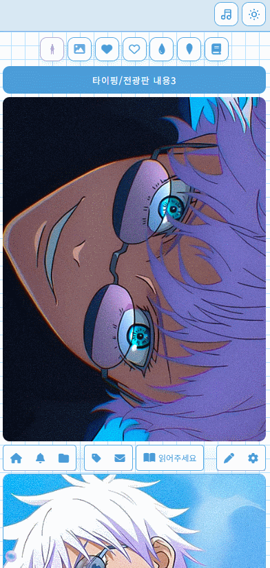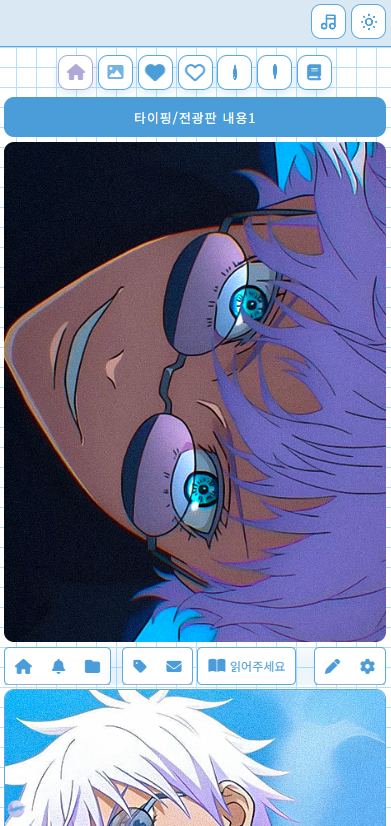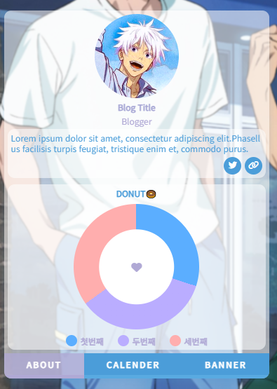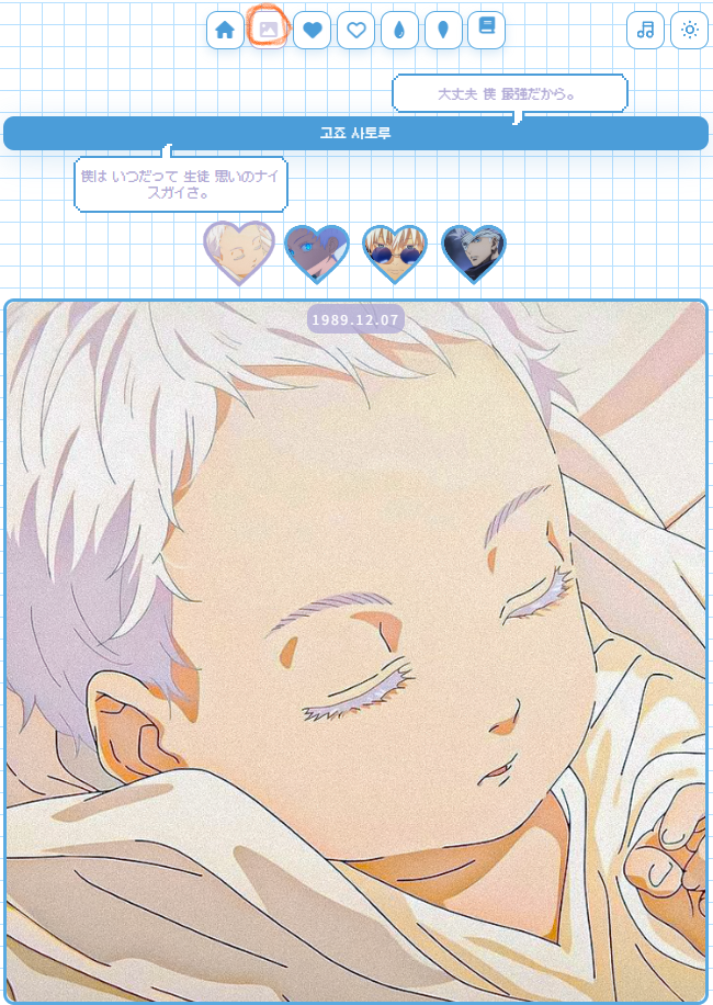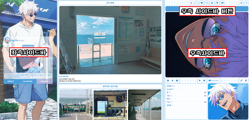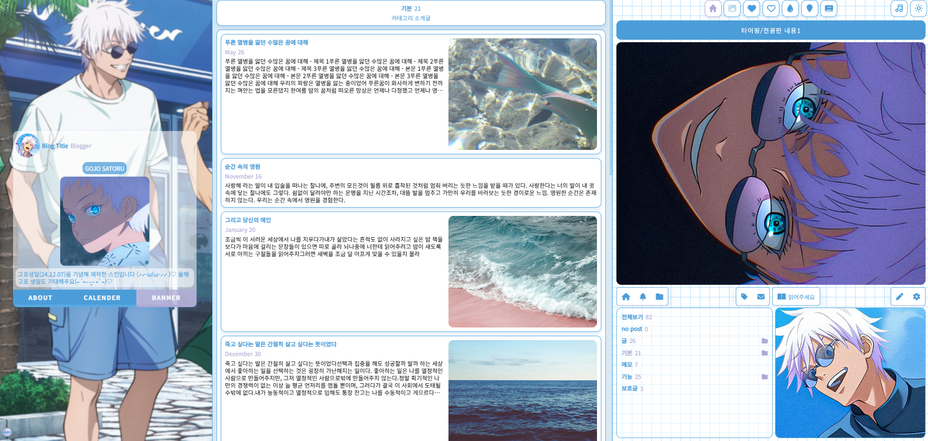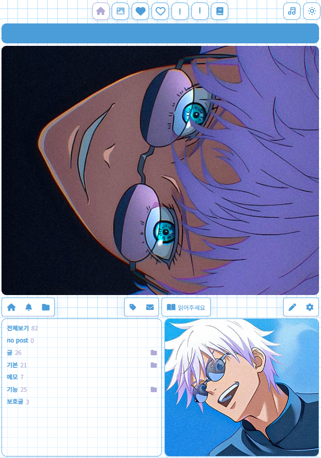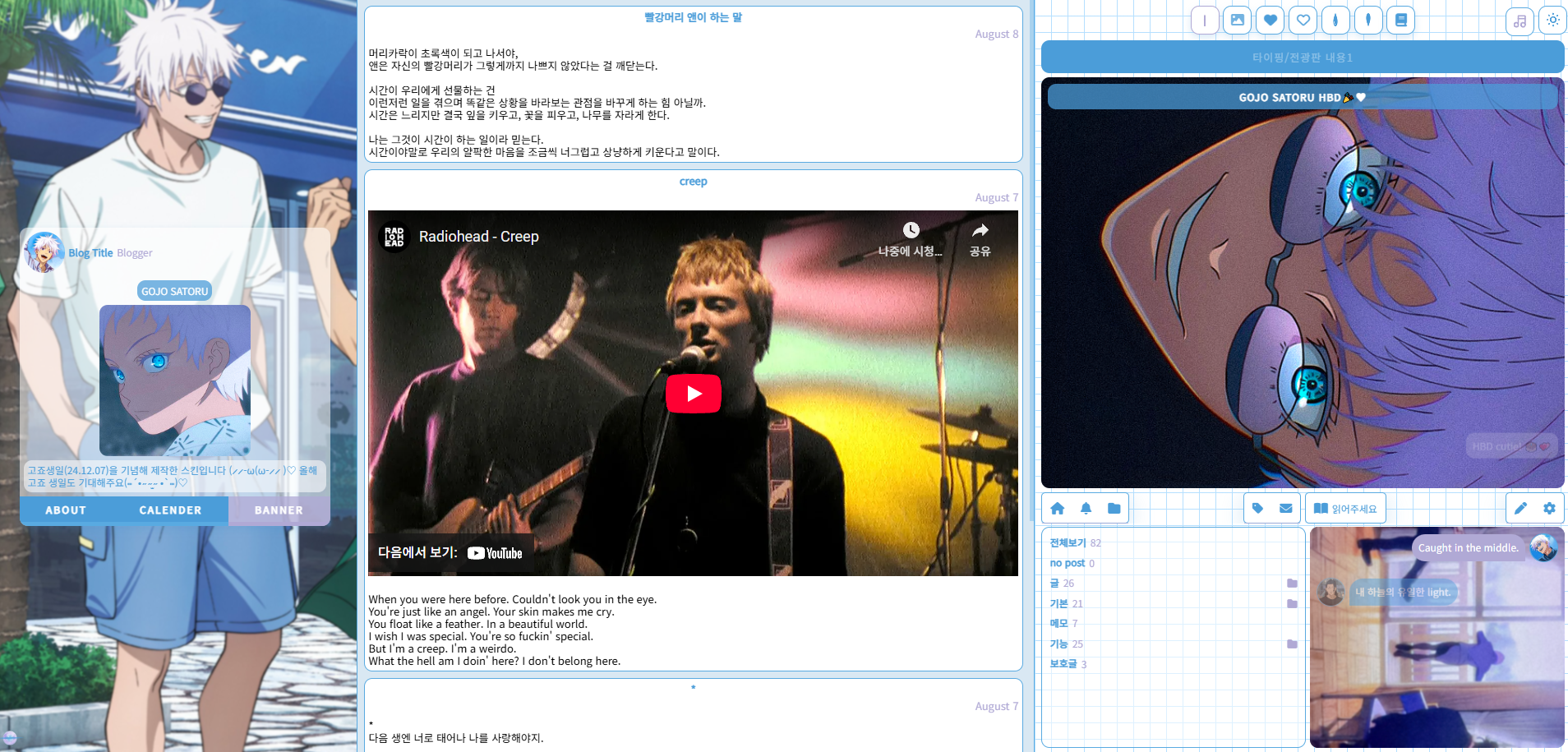 + 이 스킨은 고죠 생일을 기념해서 제작된 스킨이라 기본 이미지와 글 역시 모두 고죠 관련 내용으로 넣어뒀습니다 ʕ•ᴥ•ʔ—♡ (스킨적용시 처음엔 고죠 이미지/글만 보일 수 있으니 참고해주세요)