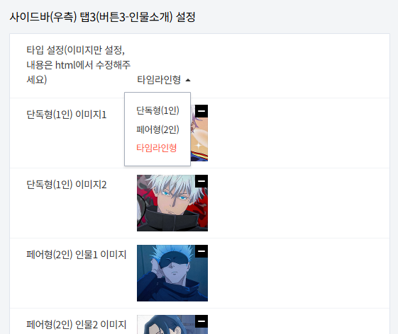 * 타입 선택 후 이미지는 스킨편집창에서 수정, 내용은 html에서 수정해주셔야 합니다. * 단독(1인) 사용하실 분들을 위해 버튼4는 사용/미사용 설정이 가능합니다. * 단독(1인) 사용하시는 분들은 버튼4는 미사용 / 혹은 타임라인형으로 사용해주시면 될 것 같습니다.