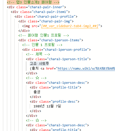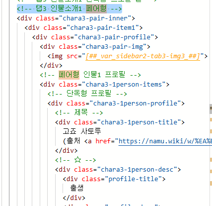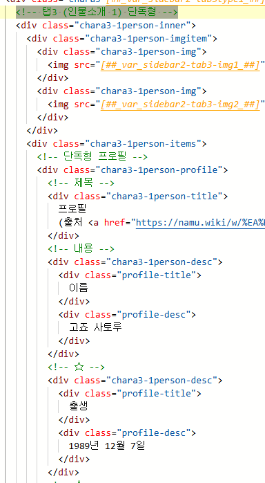 * 버튼 3 단독형(1인) 수정방법 - 스킨편집하기 - html - ctrl+f(찾기) - <!--탭3 (인물소개 1) 단독형 --> 검색