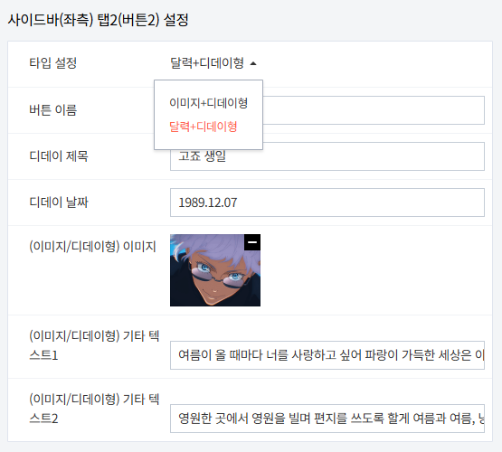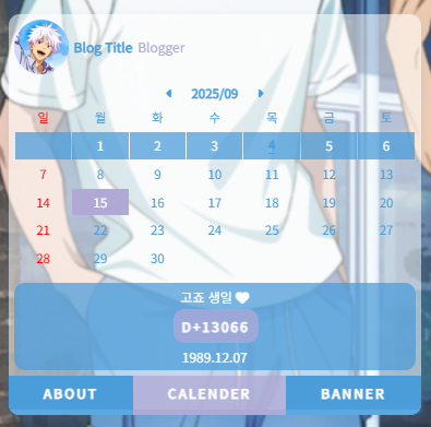 * 위 이미지 순서대로 이미지+디데이형 / 달력+디데이형 * 마찬가지로 스킨편집창에서 타입 선택, 디데이 제목 및 날짜 / 이미지 / 텍스트 수정해주세요. * 디데이는 - / . 모두 사용 가능합니다. (예 1989.12.07 1989-12-07 1989/12/07)