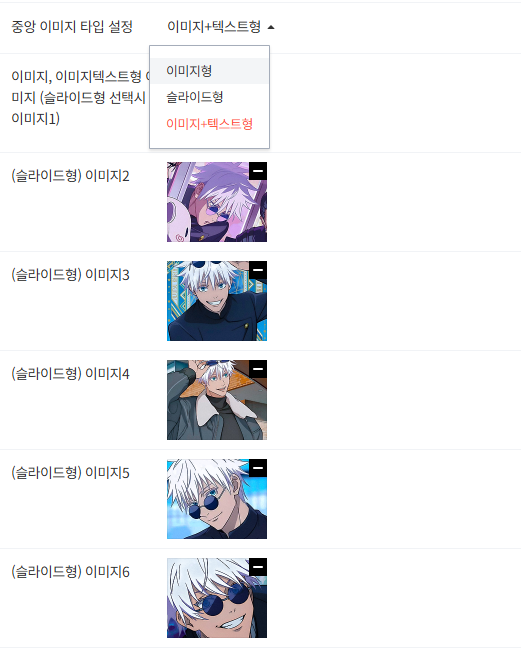 * 위 이미지 차례대로 이미지형 / 슬라이드형 / 이미지+텍스트형 * 타입선택 후 스킨편집창에서 수정