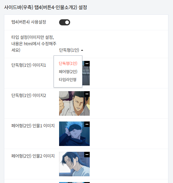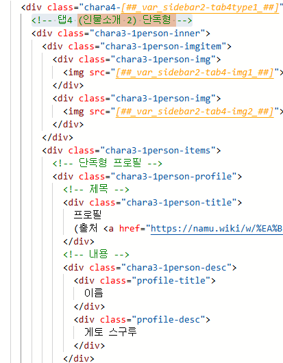 * 버튼 4 단독형 (1인) 수정방법 - 스킨편집하기 - html - ctrl+f(찾기) - <!-- 탭4 (인물소개 2) 단독형 --> 검색