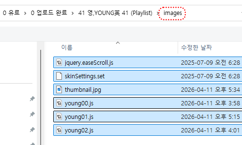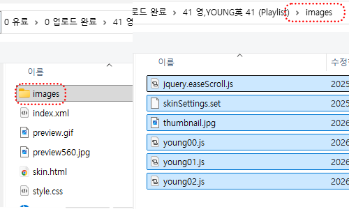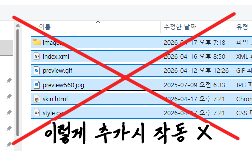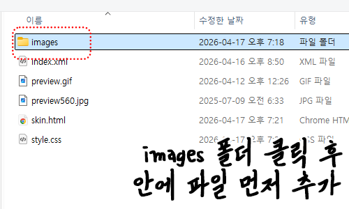 - 압축파일 해제한 파일에서 images에 있는 파일을 모두 업로드 해주세요- 스킨 폴더에서 모두 선택 X, images 폴더 따로 클릭 - 그 안에 파일 추가해주시면 됩니다
