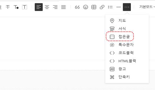 본문 작성시 접은글 작성 후 좌측 상단 기본모드 - HTML 모드로 변경